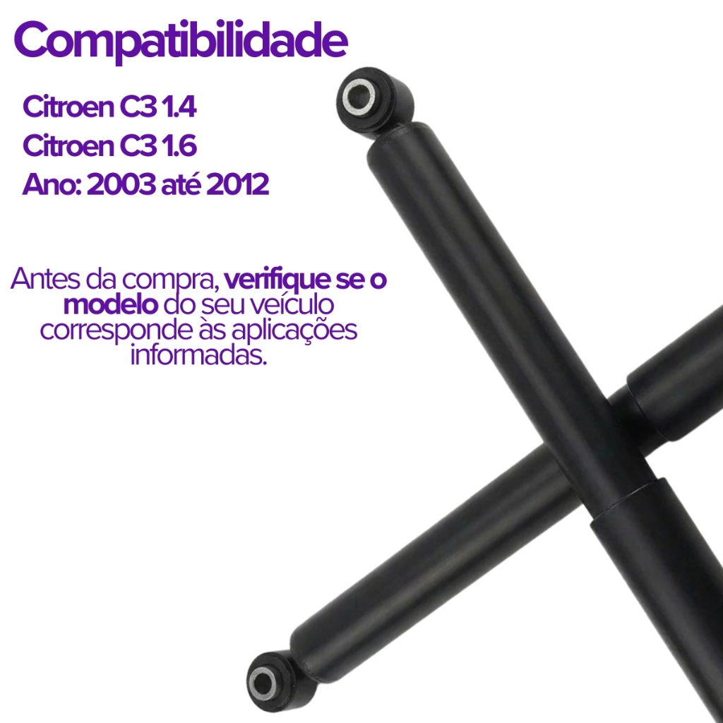 PAR DE AMORTECEDORES TRASEIROS A GÁS - CITROEN C3 (2003-2012) Recupere o conforto e a estabilidade do seu Citroen C3 com a tecnologia de pressurização a gás da YEN Distribuidora. COMPATIBILIDADE CONFIRMADA: Veículo: Citroen C3 Motorização: 1.4 e 1.6 Anos: 2003, 2004, 2005, 2006, 2007, 2008, 2009, 2010, 2011, 2012. O QUE VOCÊ RECEBE: 02 Amortecedores Traseiros a Gás (Lado Direito e Esquerdo). Nota Fiscal e Garantia. FICHA TÉCNICA: Marca: YEN Distribuidora Tecnologia: Pressurizado a Gás (Maior desempenho que óleo) Códigos de Referência: GB27531M / 349176 / SP822 / HG31125 Condição: Produto Novo POR QUE ESCOLHER ESTE PRODUTO? 1. Segurança: Mantém os pneus em contato constante com o solo. 2. Conforto: Redução drástica de vibrações e impactos. 3. Durabilidade: Buchas reforçadas e solda de alta resistência. GARANTIA E SUPORTE: Garantia legal de 90 dias + Garantia estendida de fábrica (totalizando até 2 anos contra defeitos de fabricação). Equipe pronta para tirar dúvidas no chat. ENVIO RÁPIDO: Compras confirmadas até as 15:00 (dias úteis) são enviadas no mesmo dia! IMPORTANTE: Verifique se o modelo do seu carro corresponde às fotos e descrição antes da compra.