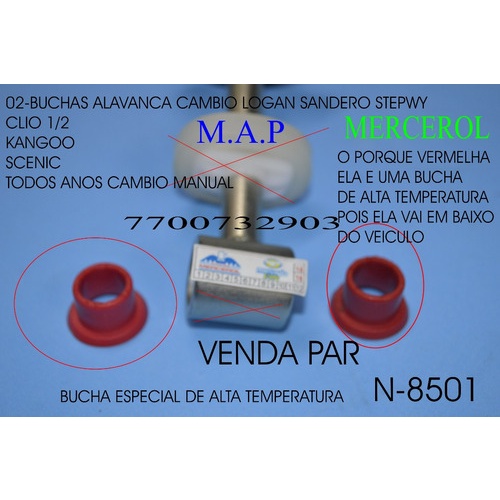 2 - bucha Alavanca Cambio Logan/sandero/clio/kangoo/scenic ORIGINAL RENAULT COD. REFERÊNCIA:7700732903 Aplicação: Logan / Sandero / Clio / Kangoo / Scenic 1 - PAR DE BUCHAS *INFORMAÇÕES IMPORTANTES* 1 - NOSSOS PRODUTOS NÃO SÃO RECOMENDADOS PARA ADAPTAÇÕES, MAS SIM PARA REPOSIÇÃO. 2 - ANALISE COM CAUTELA A APLICAÇÃO DA PEÇA E, SE NECESSÁRIO, VERIFIQUE COM SEU MECÂNICO DE CONFIANÇA UTILIZANDO AS FOTOS DO ANÚNCIO PARA TER CERTEZA DE QUE ESTA É A PEÇA QUE VOCÊ REALMENTE PRECISA. 3 - SE ASSEGURE DE ESTAR EFETUANDO A COMPRA CORRETA PARA EVITAR EVENTUAIS PROBLEMAS E GASTOS. 4 - PRODUTOS QUE NECESSITAM INSTALAÇÃO A MESMA DEVE SER FEITA POR UM PROFISSIONAL CAPACITADO. 5 - NÃO NOS RESPONSABILIZAMOS POR USO INDEVIDO OU INSTALAÇÃO INCORRETA. 6 - NÃO ACEITAMOS DEVOLUÇÃO DO PRODUTO SEM A EMBALAGEM ORIGINAL. 7 - TODOS PRODUTOS SÃO NOVOS COM 3 MESES DE GARANTIA E NOTA FISCAL. 8 - À POSTAGEM É FEITA NO MESMO DIA PARA PEDIDOS FEITO ATÉ AS 13HS. 9 - TIRE TODAS AS DUVIDAS ANTES DE CLICAR EM COMPRAR. • AGRADECEMOS A SUA PREFERÊNCIA! 2X N-8501
