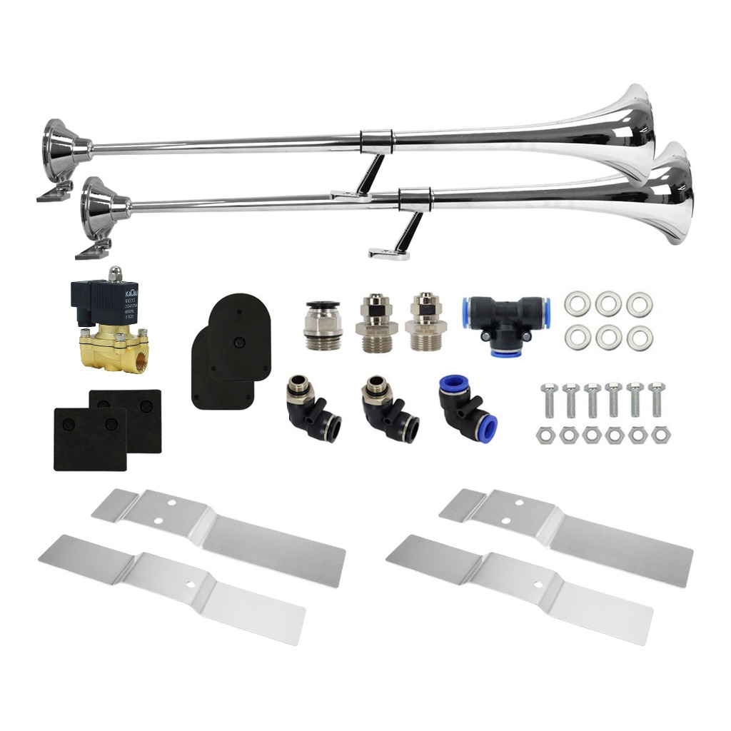 Par Buzina Maritima 1 Metro Com Suporte Kit Completo Com Válvulas Conexões Cromada Som Muito Forte