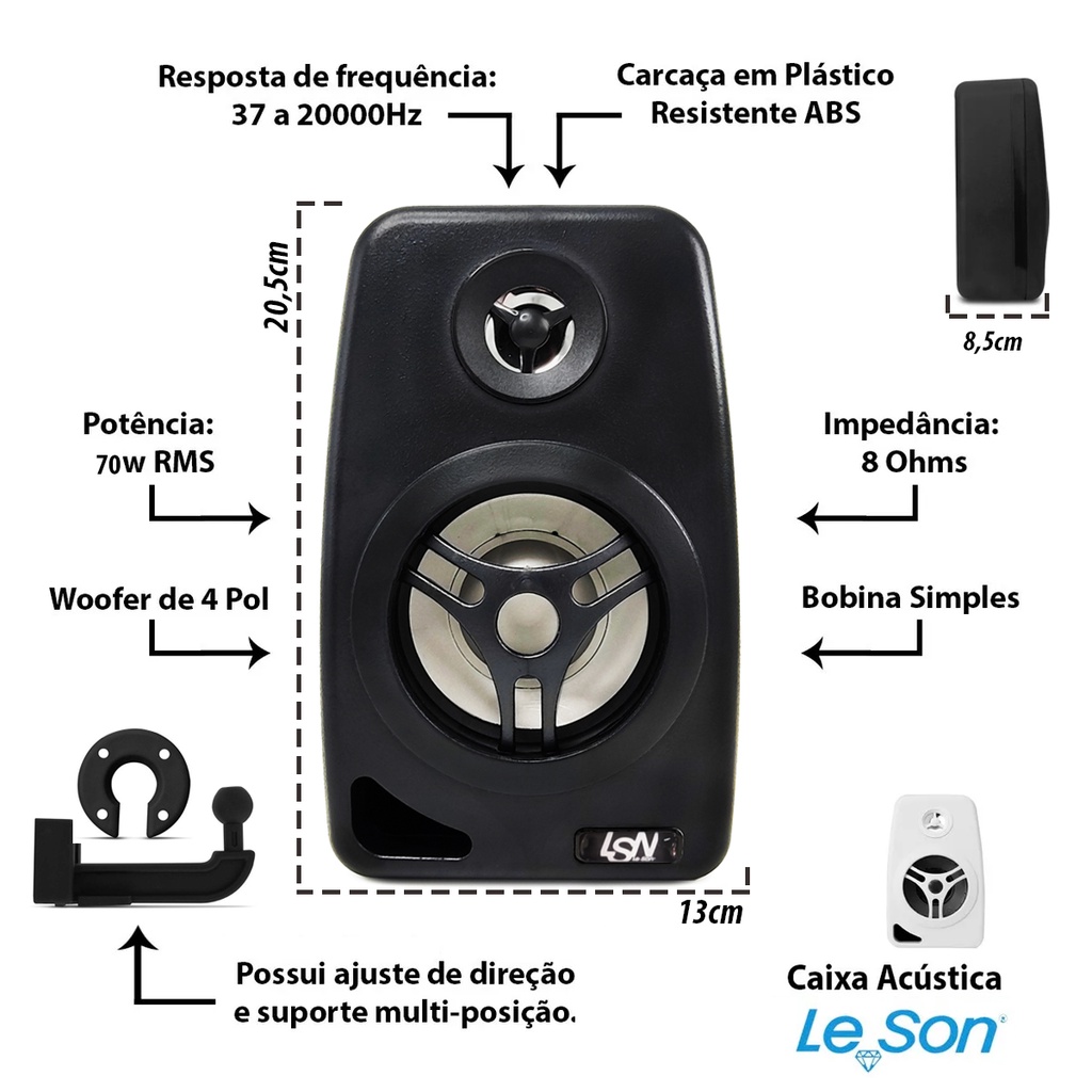 Mais de 15 anos de experiencia no mercado com os melhores produtos e o melhor atendimento! 2 CAIXAS DE SOM AMBIENTE 55W PRETA LESON Caixas de Som da Leson com alto-falante de 4 polegadas, reproduzindo som com ate 55W de potencia RMS. E uma otima opcao para potencializar o som ambiente, podendo ser facilmente instaladas com paredes e colunas e posicionadas de acordo com suas necessidades. Caracteristicas tecnicas da caixa de som: . Cor: Preta . Woofer de 4 Polegadas . Potencia: 55W RMS . Impedancia: 8 Ohms . Sensibilidade: 84 Db . Resposta de frequencia: 37 a 20000Hz . Bobina simples . Carcaca em Plastico Resistente ABS . Dimensoes Aproximadas: 23x13x7 cm . Possui Ajuste de Direcao e Suporte multi-posicao . Otimo Acabamento FABRICANTE: LESON Conteudo da embalagem: 2 Caixas de som (com suporte para fixacao)