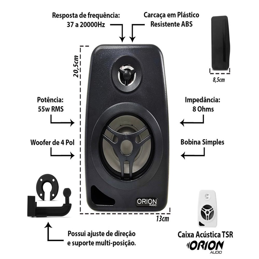 Mais de 15 anos de experiencia no mercado com os melhores produtos e o melhor atendimento! Par de Caixas de Som Ambiente com Suporte para Parede 55w Orion Caixas passivas de Som da Orion Audio com alto-falante de 4 polegadas, reproduzindo som com ate 55W de potencia RMS. E uma otima opcao para potencializar o som ambiente, podendo ser facilmente instaladas com paredes e colunas e posicionadas de acordo com suas necessidades. Elas precisam de um amplificador para tocar adequadamente ,a ligacao e por meio de fio paralelo 0,50mm acima (nao incluso) Caracteristicas tecnicas da caixa de som: . Cor: Preta . Woofer de 4 Polegadas . Potencia: 55W RMS . Impedancia: 8 Ohms . Sensibilidade: 84 Db . Resposta de frequencia: 37 a 20000Hz . Bobina simples . Carcaca em Plastico Resistente ABS . Possui Ajuste de Direcao e Suporte multi-posicao . Otimo Acabamento . Pode ser utilizada na parede, teto ou usar sem suporte em uma mesa, estante, rack. etc... . Dimensoes de 1 Caixa: - 20,5 cm Altura - 13 cm Largura - 8,5 cm Profundidade Marca : Orion Audio Conteudo da embalagem: 2 Caixas de som (com suporte para fixacao) Importante: Recomendamos que a instalacao seja feita por um profissional especializado. Nao nos responsabilizamos por defeitos por mau uso. Temos KIT's de acordo com sua necessidade, consulte-nos!