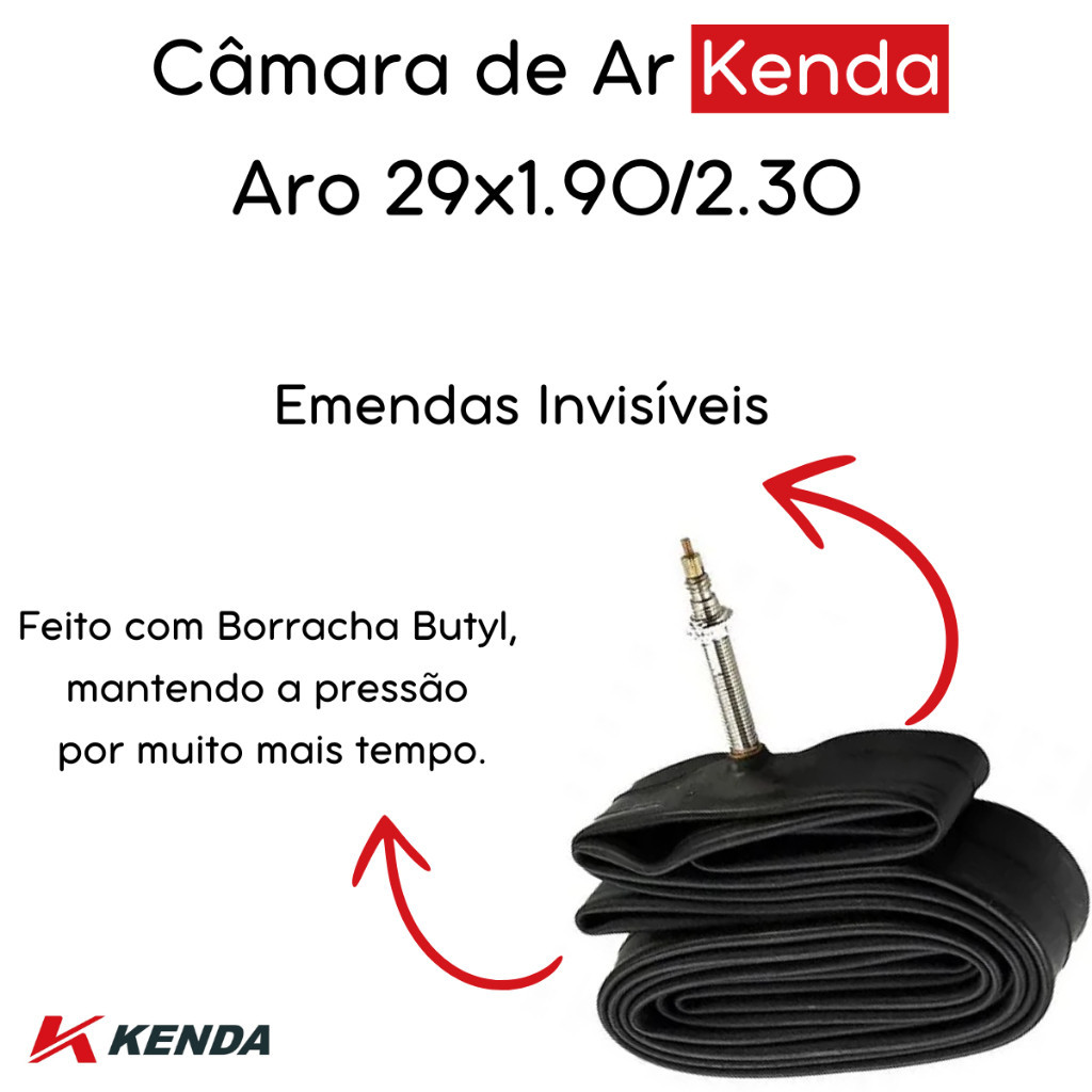 Par de Câmara de Ar Aro 29 Kenda 1.90/2.30 Válvula Presta Bico Fino 48mm Características do Produto Aro: 29 Medidas: 1.90/2.30 Válvula: Presta (Bico Fino) Comprimento da Válvula: 48mm Material: Borracha de alta qualidade Marca: Kenda Cor: Preto O Par de Câmaras de Ar Aro 29 da Kenda é ideal para ciclistas que buscam qualidade e durabilidade em suas pedaladas. Projetadas para pneus de 1.90 a 2.30, essas câmaras são equipadas com válvula Presta de 48mm, também conhecida como bico fino, proporcionando uma vedação superior e facilidade de enchimento. A Kenda é uma marca renomada no mercado de ciclismo, reconhecida pela alta qualidade de seus produtos e inovação constante. Benefícios e Utilidades Compatibilidade Universal: Adequadas para pneus aro 29 de 1.90 a 2.30, oferecendo versatilidade para diferentes tipos de bicicletas e terrenos. Válvula Presta de 48mm: Ideal para aros de perfil alto e proporciona uma vedação eficiente, garantindo a manutenção da pressão ideal por mais tempo. Durabilidade: Fabricadas com materiais de alta qualidade, as câmaras de ar Kenda são conhecidas por sua resistência e longevidade, minimizando a necessidade de substituições frequentes. Facilidade de Remendo: A borracha de alta elasticidade permite uma excelente aderência aos remendos, facilitando reparos em caso de perfurações. Desempenho Superior: Com espessura uniforme e emendas invisíveis, essas câmaras garantem uma pedalada suave e segura. Mountain Biking: Resistente a perfurações e adaptável a terrenos acidentados. Ciclismo de Estrada: Mantém a pressão ideal, oferecendo uma pedalada mais eficiente e confortável. Ciclismo Urbano: Durabilidade e resistência para o uso diário em diferentes superfícies. Recomendações Instalação: Recomenda-se a instalação por um profissional qualificado para garantir o melhor desempenho e segurança. Manutenção: Verificar regularmente a pressão das câmaras e inspecionar por danos para assegurar a longevidade e a segurança. O Par de Câmaras de Ar Aro 29 Kenda 1.90/2.30 com Válvula Presta de 48mm é a escolha perfeita para ciclistas exigentes que buscam desempenho, durabilidade e confiança. Seja para mountain biking, ciclismo de estrada ou uso urbano, as câmaras de ar Kenda garantem uma pedalada mais suave e segura. Adquira já o seu Par de Câmaras de Ar Kenda e experimente a qualidade superior em suas aventuras sobre duas rodas!