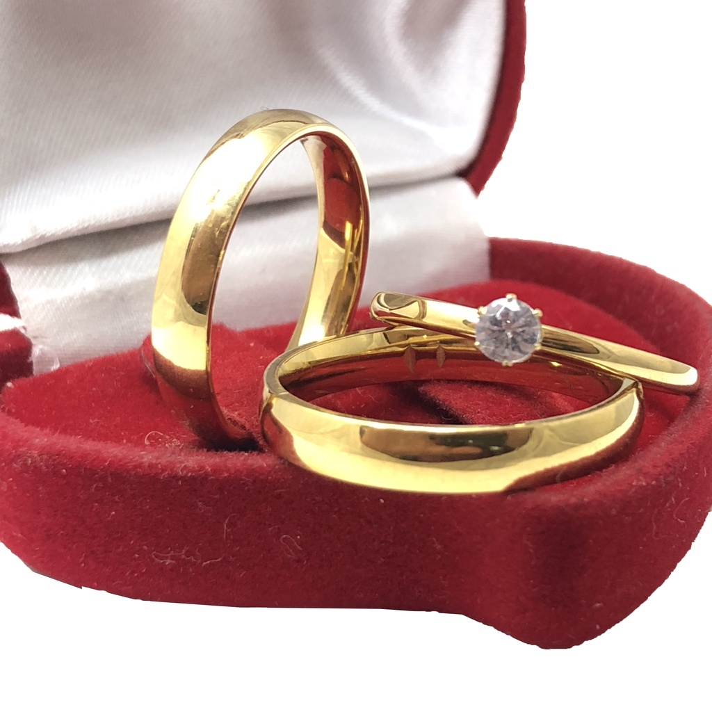 Par de Aliança Anatômica Dourada Clássica Fina 4mm de Noivado/Casamento Acompanha Caixinha de Veludo e Anel Solitário