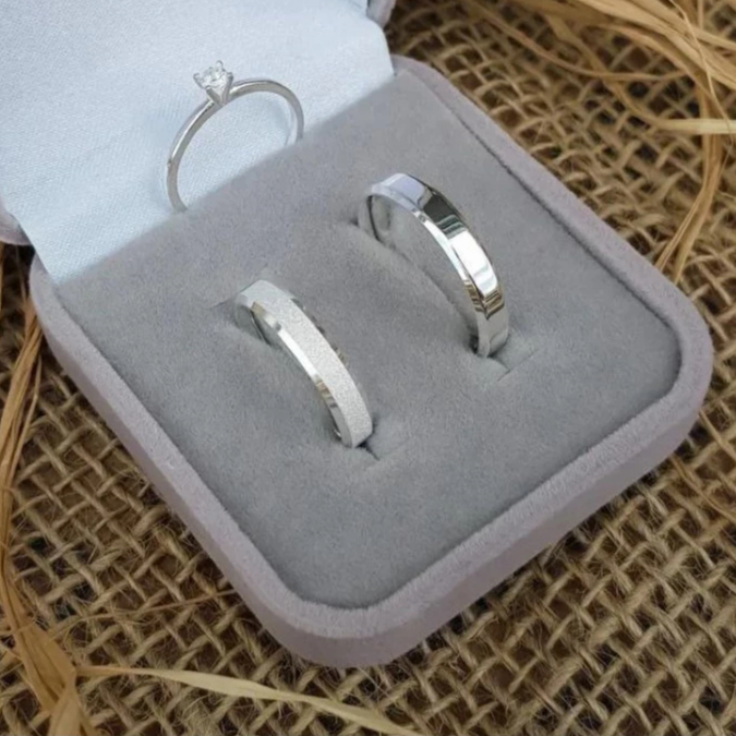 Par de Aliança de Namoro Prata Anel Solitário e Caixa de Veludo - 4mm Fina, Aliança de Namoro, Anel de Compromisso