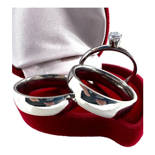 Par de aliança de Namoro Prata Grossa Espelhada Polida Lisa + Anel Solitário Zircônia
