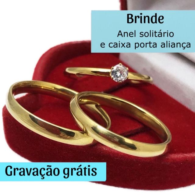 Par De Aliança Lisa Banhada A Ouro 18K Com Anel Solitário Caixa Porta Aliança E Gravação Grátis Noivado Casamento 4mm