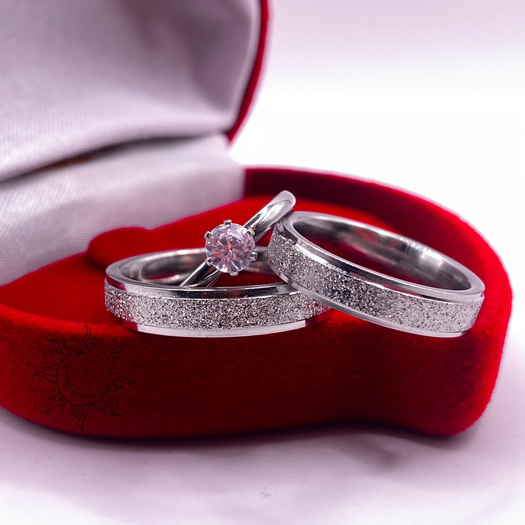 Par de Aliança Namoro Compromisso Prata Diamantada Brilhante fina 4mm + Anel Solitário