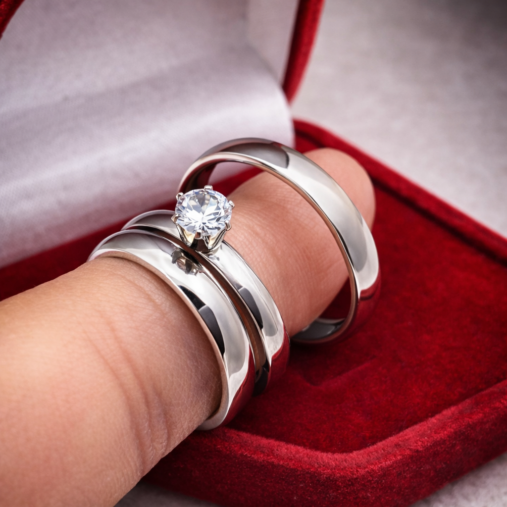 Par de Alianças Anatômica de Namoro Tradicional Lisa Polida + Anel Solitário de Compromisso Prata