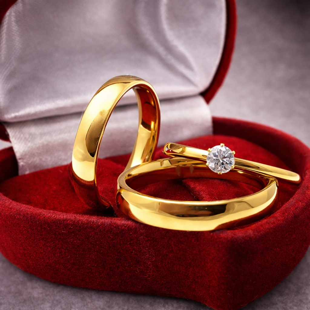 Par de Alianças de Casamento Banhada + Anel Solitário de Noivado