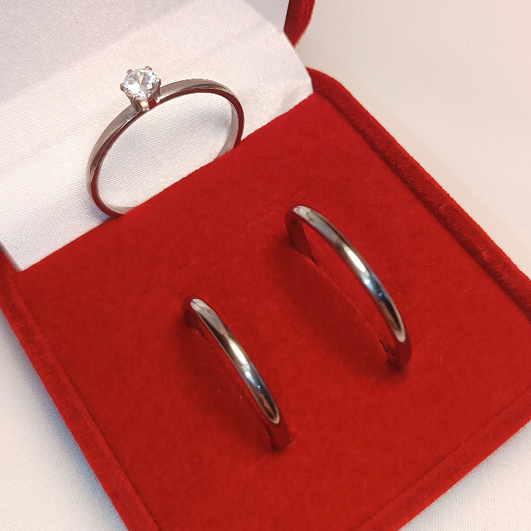 Par de Alianças de Namoro Fina + Anel Solitário Prata Aço Inox 2 mm + Caixa de Veludo Prata 950 Prata 925 Lisa Anatômica