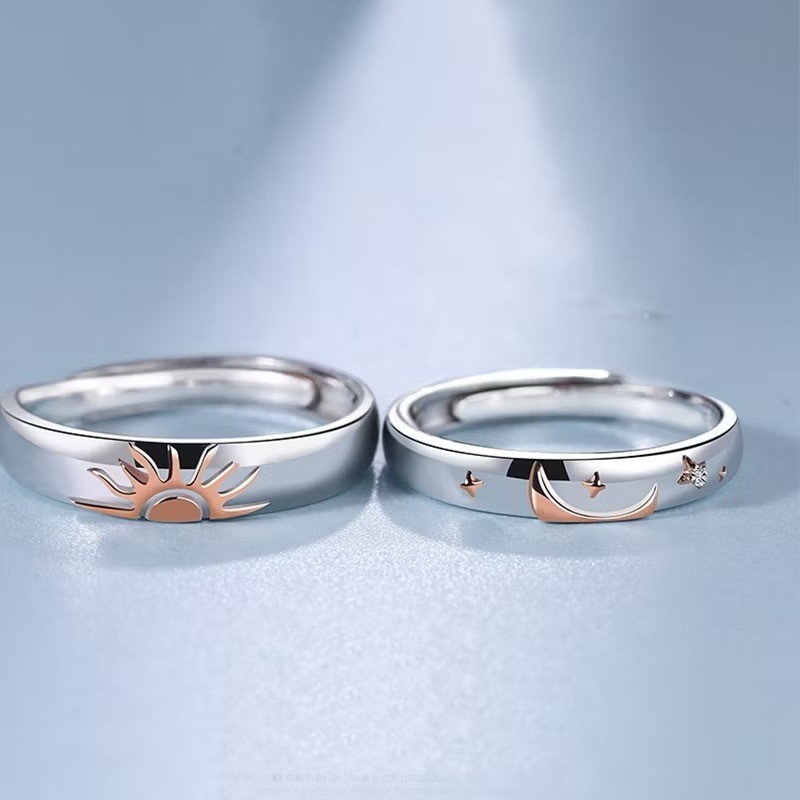 Par de Alianças Prata 925 Sol e Lua de Namoro Ajustável - Conexão e Amor em Prata 925