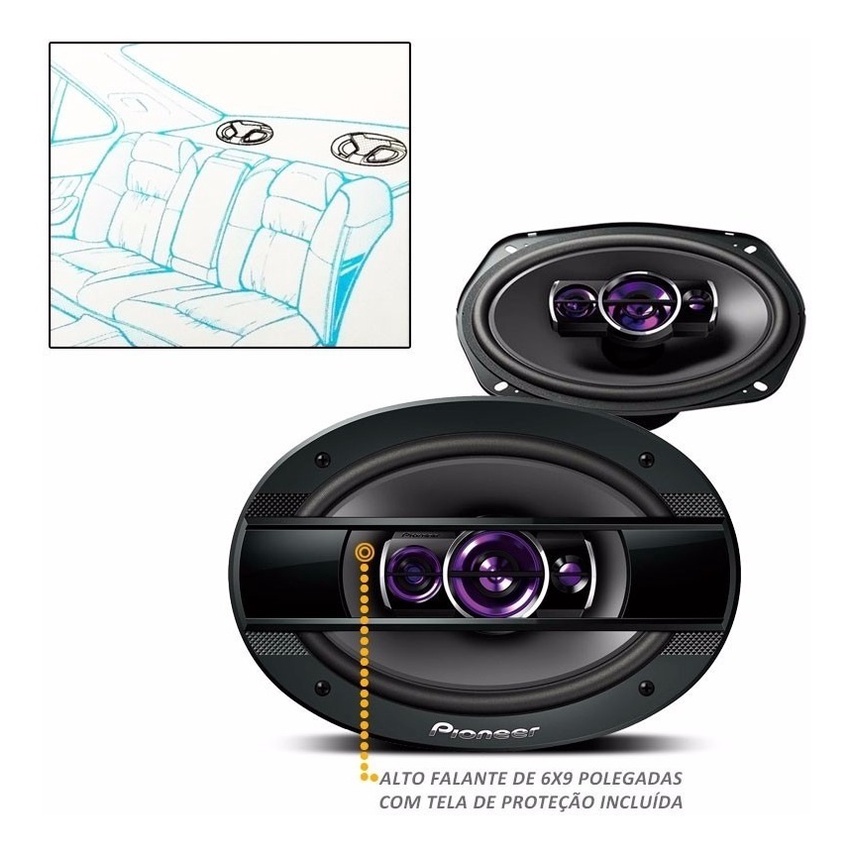 Descrição Alto Falantes Pioneer: Tenha o som da balada dentro do seu carro com o TS-6960BR, o alto-falante 6"x 9" de quatro vias da Pioneer. Desenhado para trabalhar com potências elevadas e ótima resposta em toda a faixa de frequência, tem um design novo e arrojado, que dá aquele toque especial no seu veículo. Além disso, possui um conjunto magnético poderoso, onde cada alto-falante pode trabalhar com potência nominal de 100W RMS. Atenção: 400W é a potência máxima, totalizando o par 800w é potência nominal de 100w cada totalizando o par 200w Características Alto Falantes: - Woofer com cone de IMPP (Polipropileno moldado por injeção) - Suspensão feita com tecido - Bobina em alumínio - Midrange com cone de filme de Ø50 mm - Tweeter piezoelétrico de Ø29 mm em PET - Supertweeter piezoelétrico de PET de Ø12 mm Especificações Técnicas Alto Falantes: - Potência máxima - 400 W - Potência de entrada nominal RMS - 100 W - Resposta em frequência - 26 Hz a 20.000 Hz - Sensibilidade (1 W / 1 m) - 88 dB - Frequência de ressonância - 59 Hz - Impedância - 4 ohms Dimensões: - Profundidade de instalação - 82 mm - Dimensões do alto-falante (sem tela): 234 x 164 x 98 mm - Dimensões do alto-falante (com tela): 264 x 184 x 112 mm - Dimensões para corte - 218 x 148 mm Conteúdo da embalagem: - 2 - Alto-falantes 6x9" Pioneer TS-6960TBR - 100W RMS cada (com tela)