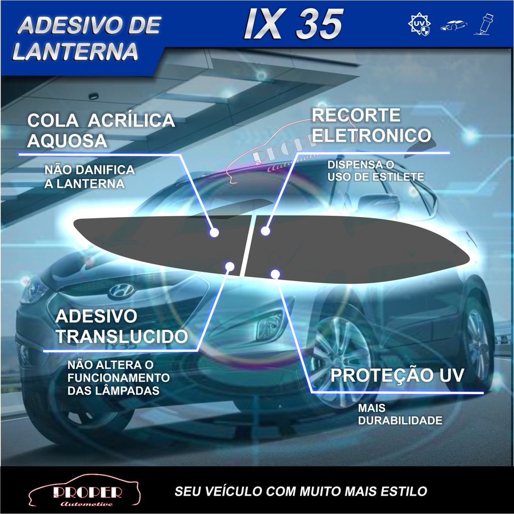 Bem Vindos a Loja Oficial Proper Automotive Par de Adesivos De Lanterna Para o Hyundai Ix35. *** Valor referente ao Par *** Sabe aquele detalhe que faz toda a diferença? Com os adesivos de lanterna Proper Automotive, você consegue mudar o visual do seu veículo de forma sutil, de forma rápida com uma instalação simples, sem precisar desmontar a lanterna e sem o uso de estilete, pois são no formato ideal e recortados eletronicamente. Características - Produzidos em vinil automotivo translucido - Cola acrílica aquosa - Recortados eletronicamente - Modelos exclusivos feitos sob medida Com certeza é o que esta faltando para adicionar muito mais estilo no seu veículo! Desenvolvido, produzido e distribuído pela Proper Automotive.