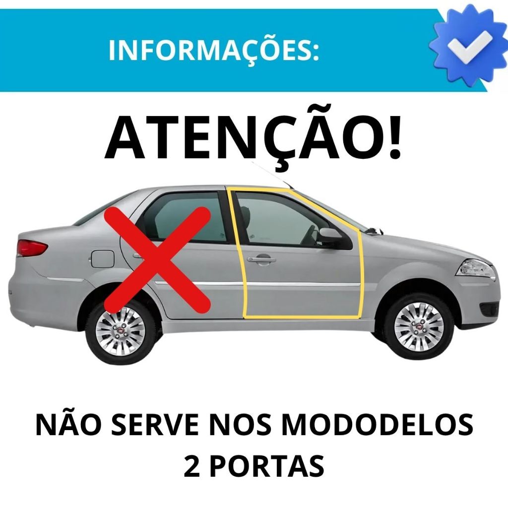 JOGO COM 2 BORRACHAS PARA VEDAÇÃO DE ÁGUA, POEIRA E VENTO * NÃO SERVE NO PALIO / SIENA 2 PORTAS - NÃO SERVE SERVE PARA OS MODELOS FIAT: Fiat Siena - TODOS OS ANOS 4 PORTAS KIT COMPOSTO POR 2 PEÇAS: 2 Borrachas DIANTEIRAS APENAS (medindo 3m330 aprox.) ATENÇÃO ANTES DA INSTALAÇÃO: É POSSIVEL REALIZAR CORTE NA BORRACHA PARA AJUSTE FINAL. AS MEDIDAS DEVEM SER CONFERIDAS COM A BORRACHA RETIRADA DO VEÍCULO, EVITANDO ASSIM PERDA DA GARANTIA DA PEÇA OU TROCA POR INCOMPATIBILIDADE. INSTALAÇÃO DEVE SER FEITA COM UM PROFISSIONAL. BENEFICIOS: - Protege seu veículo contra poeira, vento e chuva; - Reduz o ruído do vento enquanto dirige; - Ajuda a manter o interior do seu carro limpo e seco; - Fácil de instalar e ajuste perfeito; - Fabricada com materiais de alta qualidade para maior durabilidade; - Pode melhorar a aparência estética do seu veículo; - Substituir borrachas de porta antigas e desgastadas pode ajudar a melhorar a eficiência energética do seu carro; - A troca da borracha de porta pode aumentar o valor de revenda do seu carro; - Economiza dinheiro a longo prazo, pois uma borracha de porta nova pode ajudar a evitar reparos caros no futuro;