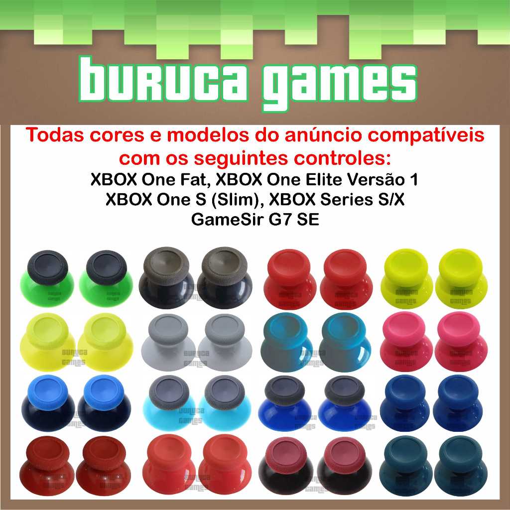 Par de Botões Analógicos para controle de Xbox One e XBOX Series Edição Especial, Limitada ou personalizados, compatíveis com controles originais e alguns paralelos; Compatível com os seguintes controles: - XBOX One Fat (antigo) - XBOX One Elite Versão 1 - XBOX One Slim e X - XBOX Series X/S; - GameSir G7 SE (testado pela equipe Buruca Games) Todas as cores e modelos do anuncio são compatíveis com todas versões de controles acima citados, porém alguns tem o design no padrão do controle de XBOX One e alguns com design no padrão do controle versão de XBOX Series Algumas edições de controles que utilizam estas cores de botão analógico: - Controle de XBOX One S Edição Especial Sport; - Controle de XBOX One S Edição Especial Artic; - Controle de XBOX One S Grooby; - Controle de XBOX One S Edição Especial Sport White; - Controle de XBOX One S Gears 5- XBOX Series Mineral Camo- XBOX Series Pulse Red - XBOX Series Shock Blue - XBOX Series Electric Volt - XBOX Series Deep Pink - XBOX Series Velocity Green Para substituição do botão analógico gasto, danificado, etc. Material: plástico e borracha