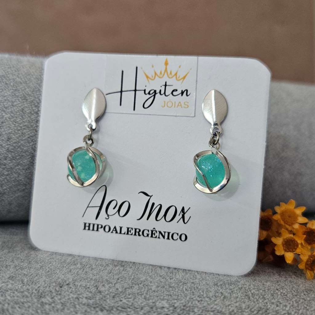 Contém no pacote: Par de brincos Material: Aço Inox Pedra: Polímero tamanho: 1cm Cores disponíveis: Azul, verde e branco Modelo: Orbe Celestial