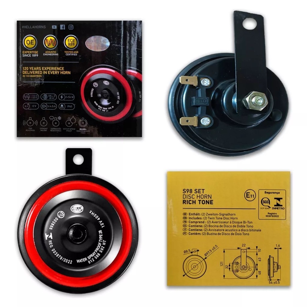 Ideal para: • Desempenho de 12V para todos os veículos Características: • Carcaça preta com vermelho com diafragma vermelho e suporte de metal galvanizado. • Tom penetrante nítido • Resistente à corrosão e a jatos de água • Livre de manutenção Especificações: • Tensão: 12V • Frequência de tom baixo: 335 Hz • Frequência de tom alto: 400 Hz • Nível de som a 6,5 pés (2 metros): 115 dB • Consumo de energia: 54W • Aprovação: ECE R28 • Suporte: montagem M8 parafuso • Temperatura operacional: -40° C a 90° C (-40°F a 194°F) • Diâmetro | Medidas: 9,8 cm (3,85”) | 9,8 x 12,2 cm O kit inclui: • (1) Buzina de disco de tom alto • (1) Buzina de disco de tom baixo • Suportes de montagem • Instruções de montagem passo a passo Garantia do vendedor: 3 meses