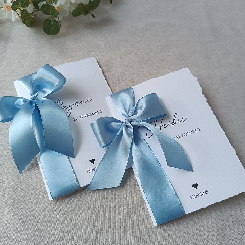 Par de Caderno de Votos dos Noivos de Casamento Personalizado Laço de Cetim Azul Serenity Claro - Papel Texturizado