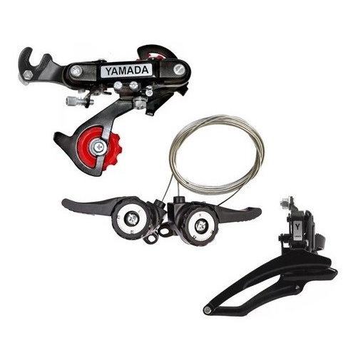 Par de Câmbios de Transmissão para Bicicleta de 18 ou 21 Marchas. Compatíveis com quadros de aço ou alumínio. Câmbio Traseiro 7v: Com Gancheira Marca: Yamada Cor: Preto Câmbio Dianteiro 3v: Puxa por Baixo (Abraçadeira 28,6mm) Marca: Yamada Cor: Preto Alavancas: Modelo: Nylon Marca: Yamada Cor: Preto Produto Original