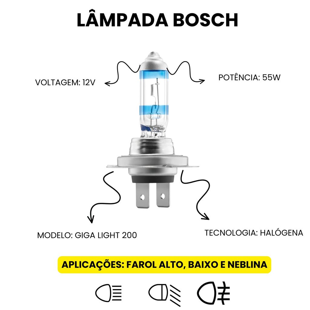 A LÂMPADA AUTOMOTIVA BOSCH GIGALIGHT PLUS 200 H7 12V 55W FOI DESENVOLVIDA PARA QUEM BUSCA MÁXIMA PERFORMANCE E SEGURANÇA NA CONDUÇÃO NOTURNA. COM ATÉ 200% MAIS LUMINOSIDADE EM COMPARAÇÃO ÀS LÂMPADAS HALÓGENAS CONVENCIONAIS, ELA OFERECE VISÃO SUPERIOR DA ESTRADA, DESTACANDO MELHOR OBSTÁCULOS, PEDESTRES E SINALIZAÇÕES. - FACHO MAIS LONGO E CONCENTRADO, AMPLIANDO A VISIBILIDADE NOTURNA - VIDRO DE QUARTZO UV E CONSTRUÇÃO REFORÇADA PARA MAIOR DURABILIDADE E RESISTÊNCIA TÉRMICA - SUBSTITUIÇÃO DIRETA — INSTALAÇÃO SIMPLES E RÁPIDA PRINCIPAIS CARACTERÍSTICAS: * MARCA: BOSCH * MODELO: GIGALIGHT PLUS 200 – 1987301145 * CONECTOR: H7 * TECNOLOGIA: HALÓGENA * VOLTAGEM: 12V * POTÊNCIA: 55W * BASE: PX26D * ATÉ 200% MAIS LUZ QUE LÂMPADAS PADRÃO * TONALIDADE DE COR: AMARELA COMPATIBILIDADE: - INDICADA PARA VEÍCULOS QUE UTILIZAM LÂMPADAS H7 NOS FARÓIS PRINCIPAIS (ALTO OU BAIXO). POR QUE ESCOLHER BOSCH GIGALIGHT PLUS 200? PORQUE COMBINA POTÊNCIA, QUALIDADE E SEGURANÇA, COM A CONFIABILIDADE DE UMA MARCA LÍDER MUNDIAL EM TECNOLOGIA AUTOMOTIVA. IDEAL PARA QUEM EXIGE MÁXIMO DESEMPENHO E ILUMINAÇÃO SUPERIOR EM QUALQUER CONDIÇÃO DE DIREÇÃO. CONTEÚDO DA EMBALAGEM: 02 - LÂMPADA BOSCH GIGA LIGHT PLUS 200