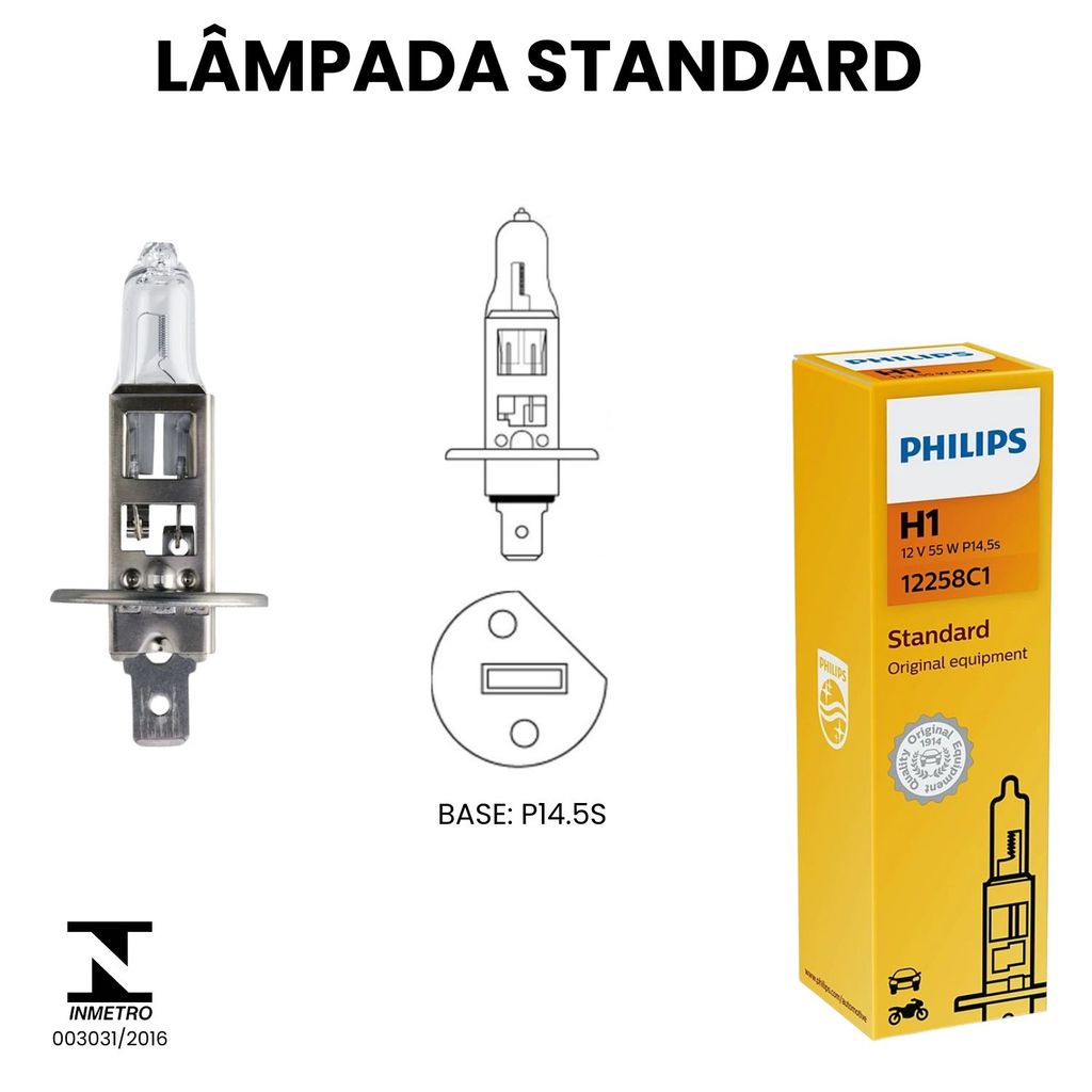 PAR LÂMPADA AUTOMOTIVA H1 PHILIPS STANDARD 12V 55W SKU: 12258C1 A LÂMPADA PADRÃO É USADA PELOS PRINCIPAIS FABRICANTES E VOCÊ PODE ENCONTRÁ-LA EM DIVERSOS VEÍCULOS NOVOS. GARANTE EFICIÊNCIA, QUALIDADE E ÓTIMA RELAÇÃO CUSTO-BENEFÍCIO. ESPECIFICAÇÕES TÉCNICAS: - APLICAÇÃO: * FAROL ALTO * FAROL BAIXO * FAROL NEBLINA - BASE: P14,5S - DESIGNAÇÃO: H1-12258-CI - LINHA: STANDARD - TECNOLOGIA: HALÓGENA - TIPO: H1 - POTÊNCIA: 55W - VOLTAGEM: 12 VOLT - INMETRO: 003031/2016 - GARANTIA: 3 MESES DIRETO COM O FABRICANTE CONTEÚDO DA EMBALAGEM: 02 - LÂMPADA H1 STANDARD 55W