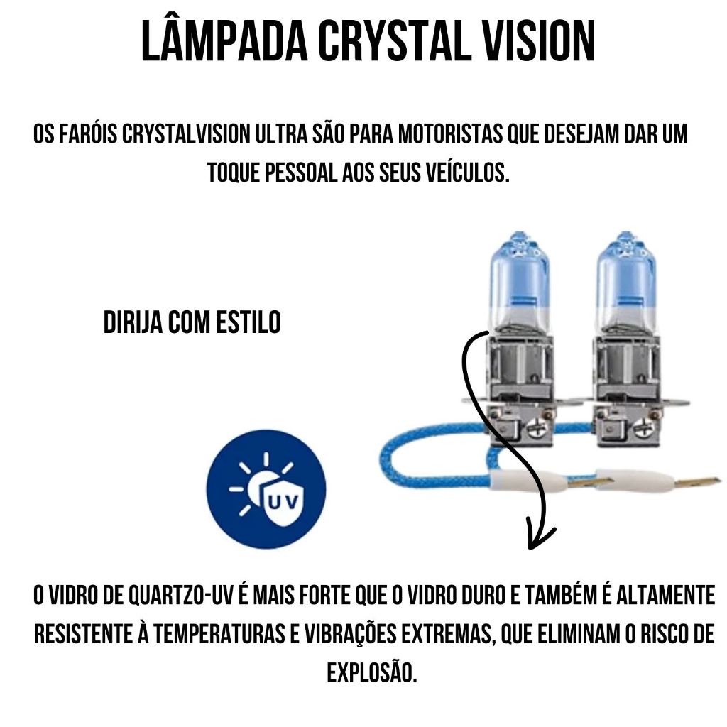 PAR DE LÂMPADA PHILIPS CRYSTAL VISION ULTRA H3 55W 12V SKU: 12336CVUSM OS FARÓIS CRYSTALVISION ULTRA SÃO PARA MOTORISTAS QUE DESEJAM DAR UM TOQUE PESSOAL AOS SEUS VEÍCULOS. DADOS TÉCNICOS: TECNOLOGIA: HALÓGENA - APLICAÇÃO: FAROL ALTO/ FAROL BAIXO/ FAROL DE NEBLINA - BASE: PK22S - LINHA: CRYSTAL VISION ULTRA - ENCAIXE: H3 - HOMOLOGAÇÃO ECE: SIM - DESIGNAÇÃO: 12336CVUSM - VOLTAGEM: 12V - POTÊNCIA: 55W - TEMPERATURA DE COR: ATÉ 4100K - VIDA ÚTIL: B3/Tc = 150/400 DÚVIDAS FREQUENTES – MD2 SOM 1) Como sei qual lâmpada é compatível com meu carro ou moto? Na descrição de cada produto indicamos base, potência, voltagem e conector. Se ainda tiver dúvidas, entre em contato pelo campo de perguntas informando modelo, ano e versão do veículo. 2) As lâmpadas vendidas são originais? Sim! Todos os nossos produtos são originais, com nota fiscal e garantia contra defeitos de fabricação. O prazo varia de acordo com cada modelo. 3) Qual a diferença entre Crystal Vision e X-treme vision? - Linha Crystal vision: possui tonalidade de cor branco-quente (amarelado) - Linha X-treme vision: possui tonalidade de cor amarelada, com até 150% mais brilho no modelo para carros, e até 130% no modelo de lâmpadas para motos. 4) Posso instalar as lâmpadas por conta própria? Embora em muitos casos a instalação seja simples, sempre recomendamos procurar um profissional especializado para garantir segurança e melhor resultado. 5) E se o produto for incompatível? Não tem problema, basta entrar em contato com a nossa equipe de atendimento para que possamos auxiliar da melhor maneira possível. 6) Posso instalar lâmpada de moto em carro ou vice-versa? Não é recomendado usar lâmpada de moto em carro ou vice-versa, pois cada veículo exige base, potência e voltagem específicas. Algumas até podem coincidir (como H4), mas o ideal é sempre confirmar pelo modelo e ano do veículo para evitar problemas de compatibilidade e segurança.
