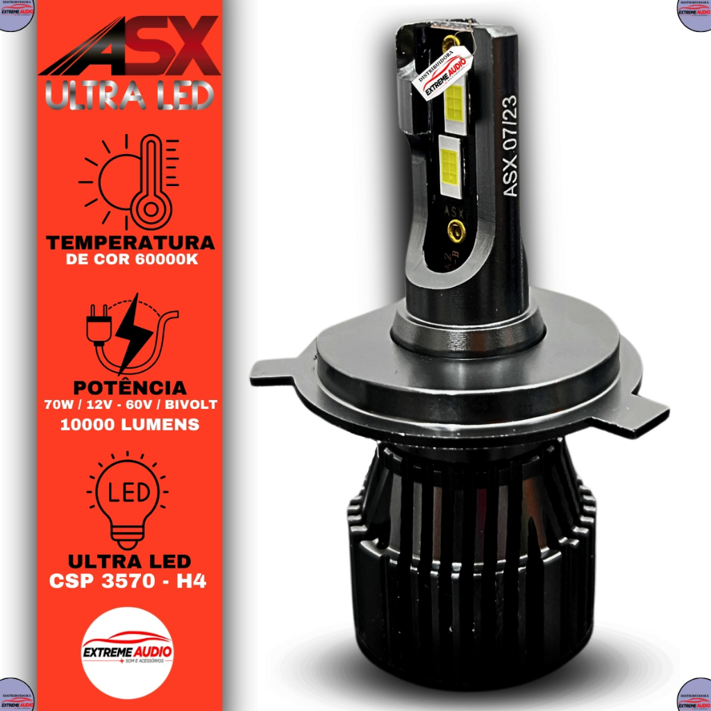 Ultra led ASX Canbus 70W 10.000 Lumens - Lancamento 2023 - Novo Ultra Led ASX com Chip modelo Csp 3570 de 10.000 Lumens - Led com canbus (nao acusa lampada queimada na maioria dos veiculos) ESCOLHA O MODELO COMPATIVEL COM O SEU CARRO. Modelos Disponiveis: - H1 - H3 - H4 - H7 - H11 - H16 - H27 - HB3/HB4 Especificacoes Tecnicas: - Tecnologia ultra led CSP - Temperatura de cor 6.000k - Eficiencia de 10.000 lumens no par - Tonalidade branca - Potencia 70 w - Voltagem 12v e 24v - Quantidade de 02 leds por lampada - Com cooler - Maior vida util - Acabamento Galvanizado e cromado - Base da lampada em aluminio - Dissipador de calor em aluminio aviacao - Sem drive externo, basta plugar - Despolarizado - Resistente a vibracao - Nano design a prova d'agua, nivel de impermeabilidade IP65 Conteudo da embalagem: - 02 lampadas ultra led com canbus Obs: - Antes de confirmar a compra, confira se o modelo escolhido e compativel com seu carro. Importante: - Valor unitario - Imagens meramente ilustrativas - Garantia de fabrica com duracao de 3 meses - Recomendamos que a instalacao seja feita por um profissional, e nao nos responsabilizamos pelo mau uso do produto.