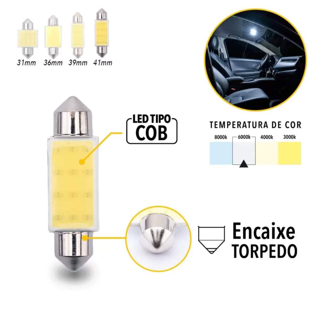 Par de Lâmpadas LED Torpedo SJ-COB-12C-41MM 12v 6000k Tarponn - TP-5034