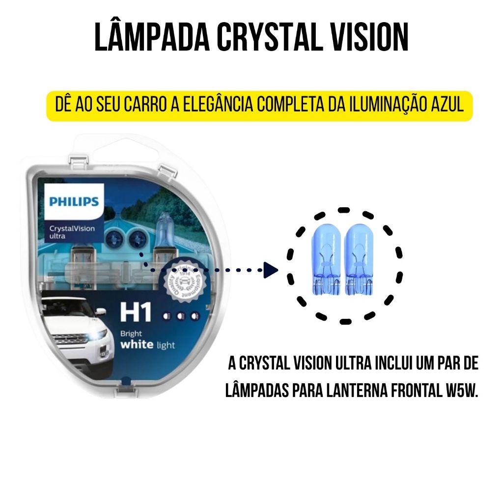 PAR DE LÂMPADAS PHILIPS CRYSTAL VISION ULTRA H1 55W SKU:12258CVUSM OS FARÓIS CRYSTAL VISION ULTRA SÃO PARA MOTORISTAS QUE DESEJAM DAR UM TOQUE PESSOAL AOS SEUS VEÍCULOS. DADOS TÉCNICOS: * APLICAÇÃO: - FAROL ALTO - FAROL BAIXO * TECNOLOGIA: HALÓGENA * BASE: P14,5S * LINHA: CRYSTAL VISION ULTRA * ENCAIXE: H1 * HOMOLOGAÇÃO ECE: SIM * DESIGNAÇÃO: 12258CVUSM * VOLTAGEM: 12V * POTÊNCIA EM WATTS: 55W * TEMPERATURA DE COR: ATÉ 4100K * VIDA ÚTIL: B3/TC = 200/350 DÚVIDAS FREQUENTES – MD2 SOM 1) Como sei qual lâmpada é compatível com meu carro ou moto? Na descrição de cada produto indicamos base, potência, voltagem e conector. Se ainda tiver dúvidas, entre em contato pelo campo de perguntas informando modelo, ano e versão do veículo. 2) As lâmpadas vendidas são originais? Sim! Todos os nossos produtos são originais, com nota fiscal e garantia contra defeitos de fabricação. O prazo varia de acordo com cada modelo. 3) Qual a diferença entre Crystal Vision e X-treme vision? - Linha Crystal vision: possui tonalidade de cor branco-quente (amarelado) - Linha X-treme vision: possui tonalidade de cor amarelada, com até 150% mais brilho no modelo para carros, e até 130% no modelo de lâmpadas para motos. 4) Posso instalar as lâmpadas por conta própria? Embora em muitos casos a instalação seja simples, sempre recomendamos procurar um profissional especializado para garantir segurança e melhor resultado. 5) E se o produto for incompatível? Não tem problema, basta entrar em contato com a nossa equipe de atendimento para que possamos auxiliar da melhor maneira possível. 6) Posso instalar lâmpada de moto em carro ou vice-versa? Não é recomendado usar lâmpada de moto em carro ou vice-versa, pois cada veículo exige base, potência e voltagem específicas. Algumas até podem coincidir (como H4), mas o ideal é sempre confirmar pelo modelo e ano do veículo para evitar problemas de compatibilidade e segurança.