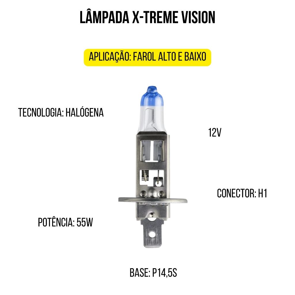 PAR DE LÂMPADAS PHILIPS X-TREME VISION PRO150 H1 12V 55W 3450K SKU: 12258XVPS2 ATRAVÉS DA COMBINAÇÃO DE UM BRILHO IMPRESSIONANTE COM O TIPO DE VIDA ÚTIL ANTERIORMENTE INDISPONÍVEL EM TAIS LÂMPADAS DE ALTO DESEMPENHO, AS X-TREMEVISION PRO150 DA PHILIPS PROPORCIONAM A VISIBILIDADE NECESSÁRIA PARA MANTER OS CONDUTORES E OS SEUS ENTES QUERIDOS AINDA MAIS SEGUROS NA ESTRADA. DADOS TÉCNICOS: - APLICAÇÃO: FAROL ALTO / FAROL BAIXO - TECNOLOGIA: HALÓGENA - TIPO: H1 - ALCANCE: X-TREME VISION PRO150 - HOMOLOGAÇÃO ECE: SIM - DESIGNAÇÃO: H1 12258 XVP 12V 55W P14,5S S2 - BASE: P14,5S - VOLTAGEM: 12V - POTÊNCIA: 55W - TEMPERATURA DE COR: 3450K - LÚMENS: 1550 +/- 15% - VIDA ÚTIL: 350H DÚVIDAS FREQUENTES – MD2 SOM 1) Como sei qual lâmpada é compatível com meu carro ou moto? Na descrição de cada produto indicamos base, potência, voltagem e conector. Se ainda tiver dúvidas, entre em contato pelo campo de perguntas informando modelo, ano e versão do veículo. 2) As lâmpadas vendidas são originais? Sim! Todos os nossos produtos são originais, com nota fiscal e garantia contra defeitos de fabricação. O prazo varia de acordo com cada modelo. 3) Qual a diferença entre Crystal Vision e X-treme vision? - Linha Crystal vision: possui tonalidade de cor branco-quente (amarelado) - Linha X-treme vision: possui tonalidade de cor amarelada, com até 150% mais brilho no modelo para carros, e até 130% no modelo de lâmpadas para motos. 4) Posso instalar as lâmpadas por conta própria? Embora em muitos casos a instalação seja simples, sempre recomendamos procurar um profissional especializado para garantir segurança e melhor resultado. 5) E se o produto for incompatível? Não tem problema, basta entrar em contato com a nossa equipe de atendimento para que possamos auxiliar da melhor maneira possível. 6) Posso instalar lâmpada de moto em carro ou vice-versa? Não é recomendado usar lâmpada de moto em carro ou vice-versa, pois cada veículo exige base, potência e voltagem específicas. Algumas até podem coincidir (como H4), mas o ideal é sempre confirmar pelo modelo e ano do veículo para evitar problemas de compatibilidade e segurança.