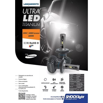 # OESTESOM # Modelos Disponíveis H1 H3 H4 H7 H11 Hb3 Hb4 H13 H27 - Todos Modelos a PRONTA ENTREGA (Consultar disponibilidade) Uma iluminação perfeita é necessária para garantir a visualização de placas, sinalizações e outros veículos. Para isso é necessário a escolha da lâmpada ideal para seu carro. As Lâmpadas UltraLED Shocklight garantem a melhor solução em iluminação automotiva, pois possuem tecnologia coreana de última geração, garantindo uma eficiência de 10.000 lúmens (5000 em cada lâmpada) que iluminam muito mais que lâmpadas halógenas comuns. Sua temperatura de 6000 K (kelvins) confere um visual com luz extremamente branca, mantendo a economia no consumo de apenas 50W (12v). Já vai com canbus incluso, evitando aviso de lâmpada queimada no painel. Certificada internacionalmente, atende aos maiores níveis de exigências, contando com nano design a prova d´água, o que combinado garante uma duração até 20 vezes maior que as lâmpadas halógenas. Tudo isso deixando seu carro ainda mais bonito e com maior qualidade de iluminação. Especificação Atendendo aos maiores níveis de exigências Linha com nano design e LED chip de última geração Potência de 50W, mais luz com menos consumo Temperatura de 6000k, extremamente branca Corpo de liga de alumínio, não necessita de cooler Acabamento galvanizado Dissipador de calor em alumínio de aviação Despolarizado, sem drive externo - basta plugar Resistente a vibrações e calor, dura até 8 vezes mais À prova d´água, Ip Rate: IP65 Linha inovadora com Certificações Internacionais de Qualidade Importante: A *OESTESOM* recomenda que a instalação seja feita por profissional especializado e não se responsabiliza pelo mau uso do produto.