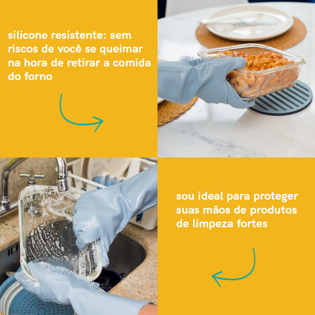 Esse é o par de luvas multifuncionais para limpeza, da OIKOS. Versátil de verdade: basicamente é uma esponja coringa que cai feito luva para as mais diferentes tarefas do dia a dia. Multiuso mesmo: dá para louças, frutas e legumes, banheiro, pets, carros e mais - só vale lembrar de ter luvas diferentes não misturar as limpezas, tá bem? Segura: bem indicada por proteger peles alérgicas, essas luvas de silicone são mais duráveis e higiênicas do que as esponjas comuns. Com cerdas auxiliares na palma da mão: fica bem fácil lavar os diversos objetos e alimentos com muito mais precisão e conforto. Silicone higiênico: não deixa cheiro ou manchas e nem provoca arranhões. Furo passante: na hora de guardar, é só pendurar o par de luvas pelo furo passante e deixar secar.