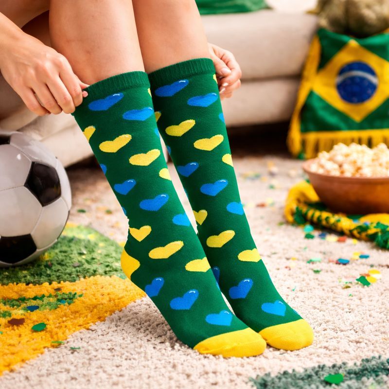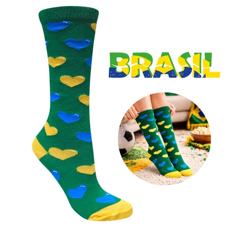 Par de Meia Cano Alto Copa Corações Brasil Torcida Infantil e Adulto Colorida