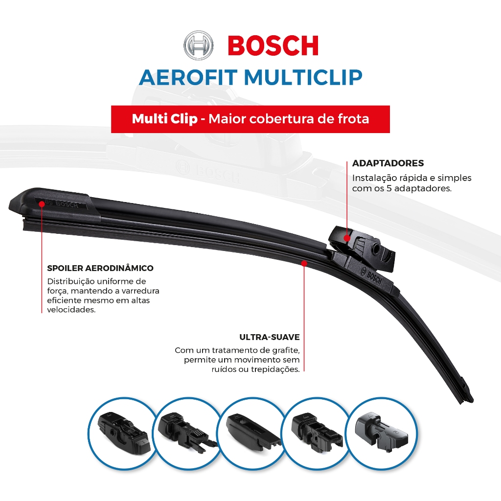 Par de Palheta Limpador de Parabrisa Multiclip Original Bosch Chevrolet A alta performance ficou ainda melhor. Palhetas que garantem mais Eficiência, Segurança, Durabilidade e Qualidade. Se é BOSCH, pode confiar. Enxergue o que vem pela frente. Kit composto por: - 1 Palheta lado direito Original Bosch - 1 Palheta lado esquerdo Aerofit Original Bosch Veículos disponíveis no anúncio: Chevrolet Agile 2012 a 2016 Chevrolet Malibu 2010 a 2017 Chevrolet Omega 2007 a 2012 Chevrolet Onix 2013 a 2018 Chevrolet Onix 2019 A 2024 Chevrolet Prisma 2013 a 2018 Chevrolet Prisma 2019 A 2024 Chevrolet S10 2012 a 2019 Chevrolet S10 2020 a 2024 Chevrolet Sonic 2012 a 2014 Chevrolet Tracker 2014 a 2019 Chevrolet TrailBlazer 2020 a 2024 Chevrolet Vectra 2008 a 2012 Chevrolet Vectra GT 2008 a 2012 Características: - Palheta BOSCH Aerofit Original - Instalação mais fácil e segura. - Maior durabilidade e eficiência comprovadas. - Sem partes metálicas expostas. Livre de desgastes de pintura e corrosão. - Spoiler aerodinâmico para ter uma distribuição uniforme de força, mantendo a varredura eficiente mesmo em altas velocidades. - Maior estabilidade em todas as situações de uso. - Funcionamento ultra suave, devido ao seu tratamento de grafite, para um movimento sem ruídos ou trepidações. - Nova embalagem moderna e atrativa. Perguntas Frequentes: Quando devo trocar as Palhetas do meu carro? - A troca deve ser realizada aos primeiros sinais de desgaste nas Palhetas. Isso porque o componente com desgaste tem a eficiência comprometida e atrapalha a visibilidade. Quais os sinais de desgaste da palheta? - Os sinais de uma Palheta com desgaste são: a Palheta não retira todo o excesso de água, faz barulho durante o funcionamento, risca o parabrisa do carro, lâmina de borracha torta, quebrada ou ressecada. Qual o prazo para a substituição das Palhetas? - Substitua as Palhetas pelo menos uma vez por ano. As Palhetas são originais? - Sim. Somos fornecedores autorizados BOSCH. Todos os produtos são originais e acompanham Nota Fiscal. Observação: - Em caso dúvidas sobre o modelo correto da Palheta para o seu carro, faça uma pergunta na parte inferior do anúncio. Temos uma equipe especializada para tirar as suas dúvidas. - O limpador de parabrisa é um acessório obrigatório por lei (artigo 230, XIX, do CTB). O não funcionamento perfeito ou mau uso do mesmo, é caracterizado como infração grave, com direito a multa e retenção do veículo. Mantenha a sua família segura. Compre Palhetas Originais BOSCH Aerofit.