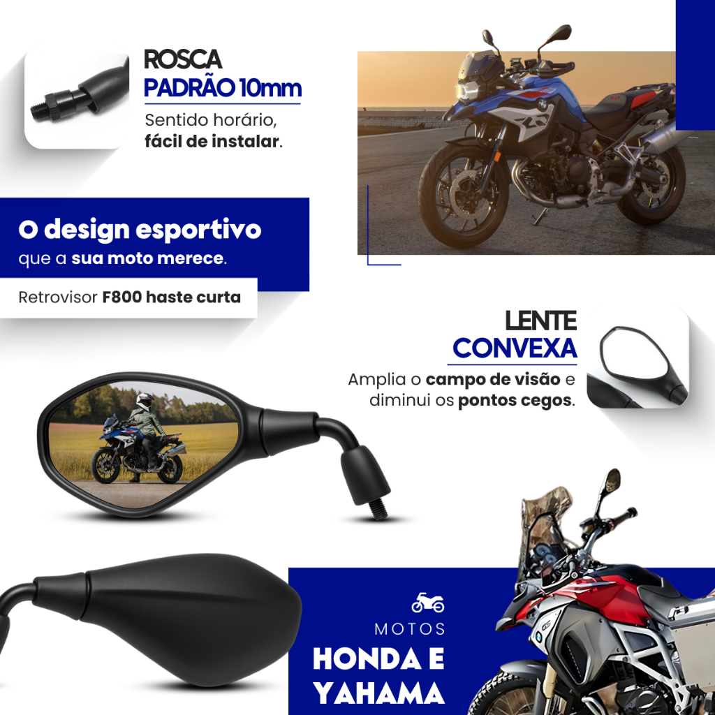 Par de Retrovisor Bmw F800 Haste Curta Rebaixada 90° Convexa Honda