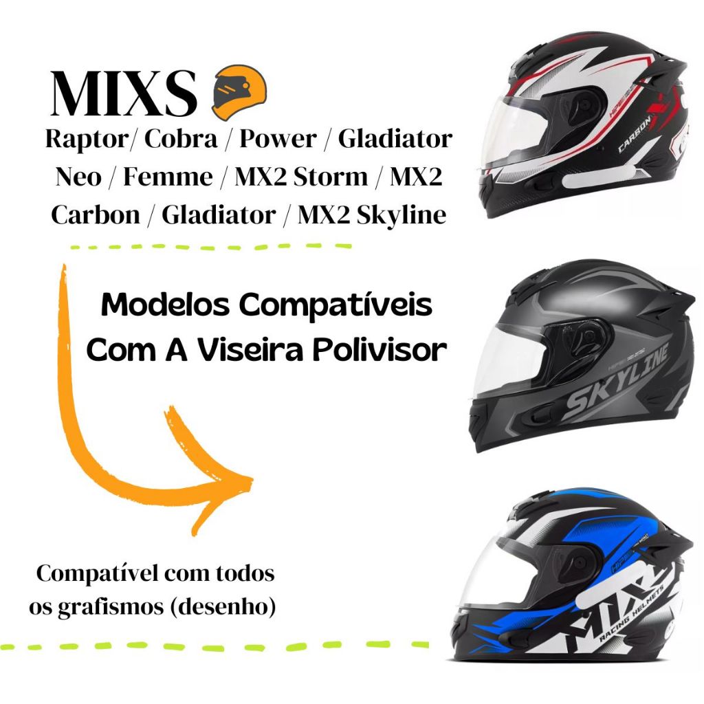 Combo de Viseiras + Kit Fixação ** ATENÇÃO , COMPATÍVEL SOMENTE COM CAPACETES ABERTOS ** Conteúdo da Embalagem: 01 Viseira Cristal 01 Viseira Fumê 01 Kit Fixação da Viseira Compatível com: Capacete MIXS | MX COBRA / RAPTOR / POWER / FEMME / GLADIATOR Especificações da Viseira: - Com tratamento resistente a risco. - Viseira em policarbonato com espessura de 2mm; - Viseira compatível com capacetes do tamanho 56, 58 e 60 - Super resistente- Alta transparência- Alta durabilidade - Boa vedação e funcionalidade no capacete- Proteção contra raios UV Instruções de uso: - Limpe somente com sabão neutro e água corrente - Não aplicar solvente químico, gasolina ou produtos abrasivos - Não aplicar vernizes ou adesivos - Troque sua viseira regularmente Importante:03 Meses de garantiaNão nos responsabilizamos pelo mau uso do produto