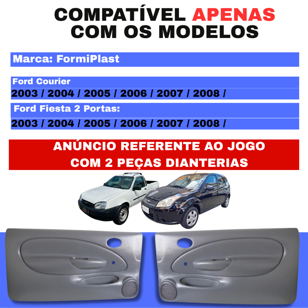 ESPECIFICAÇÕES TÉCNICAS: • Material PSAI: É um tipo de plástico termoplástico amplamente utilizado na indústria. Possui capacidade de absorver impactos sem quebrar, o que o torna ideal para produtos que precisam de durabilidade e resistência. Este material pode ser facilmente moldado em várias formas e tamanhos, permitindo a criação de designs complexos e detalhados, adequados para uma ampla gama de aplicações. COMPOSTO DE: • 2 Peças: Par Dianteiro (lado esquerdo + direito) • Acompanha parafusos de fixação COMPATÍVEL COM OS MODELOS: • Ford Courier • Ford Fiesta 2 portas • 2003 / 2004 / 2005 / 2006 / 2007 / 2008 • Vidro Manual IMPORTANTE: • Valor do anúncio se refere ao par DIANTEIRO com 2 peças • Não nos responsabilizamos por instalação mal realizada. A instalação deve ser feita por um profissional da área. Esse produto se trata de uma alternativa ao original
