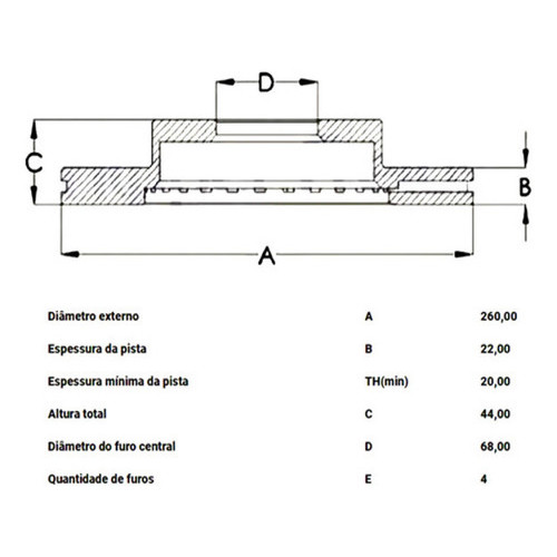 CONTEÚDO DA EMBALAGEM: 2 Discos de Freio POSIÇÃO: Dianteiro CARACTERÍSTICAS: Sem Cubo Diâmetro Externo A: 260,00 Espessura da pista B: 22,00 Espessura mínima da pista TH(min): 20,00 Altura total C: 44,00 Diâmetro do furo central D: 68,00 Quantidade de furos E: 4 GARANTIA: 03 meses APLICAÇÃO: Grand Livina 1.8 16V (2009 a 2015) Livina 1.6 16V (2009 a 2015) Livina 1.8 16V (2009 a 2015) Tiida 1.8 (2008 a 2013) ANTES DE EFETUAR A SUA COMPRA, TIRE SUAS DUVIDAS NA ABA DE PERGUNTAS!