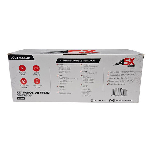 OBS: APÓS INSTALADO NOS PRIMEIROS DIAS O FAROL DE MILHA PODE FICAR EMBAÇADO (SUADO) É NORMAL, QUANTO MAIS USAR MAIS RÁPIDO ELE SOME ESSE EMBAÇADO. DESCRIÇÃO Kit farol de milha LED o mais novo lançamento da ASX, trazendo inovação e qualidade em iluminação. Um kit padrão original que já é em led, não precisando colocar nenhuma lâmpada, com um foco e linha de corte perfeita padrão projetor LED. Além, de deixar um visual muito mais moderno em seu veiculo, sendo um farol auxiliar de LED. Fácil instalação com chicote padrão original de fábrica. Compatibilidade de instalação: DIVERSOS - CITROEN : C3 09/...; C4 Hatch/Pallas/VTR 07/12; C5 05/07; Picasso 07/12 FORD : EcoSport 13/...; Fiesta 10/...(Exceto Fiesta SE); Focus 09/15; Ka Hatch/Sedan 12/...; Ranger 12/... HONDA : City 15/...; CR-V 15/15 JEEP : Renegade Todos MITSUBISHI : L200 Triton (Todas) 05/...; Pajero Full 07/13 NISSAN : Frontier (Todas) 08/... PEUGEOT : Hoggar 10/13; 207 06/10; 208 13/...; 307 06/10 RENAULT : Clio 13/...; Duster 11/...; Kwid Todos; Megane 06/09, Oroch 13/...; Logan 09/...; Sandero 09/... Especificação Técnica: • Marca: ASX • Tamanho: Padrão Original • Material: Lente em Policarbonato • Tecnologia Japonesa: LED CHIP • Sistema de dissipação: Dissipador em Alumínio • Taxa impermeável: IP65 (resistente a água) • Eficiência de LM: 5.000 Lúmens • Ângulo de irritação: 360 graus • Temperatura de Trabalho: -40 ° C ~ 105 ° C • Consumo: 40W Cada • Voltagem: BIVOLT • Voltagem: DC 12V - 60V • Cor de Temperatura : 6000K Extremamente Branca • Projetor de Foco • Regulador de Altura Conteúdo da Embalagem: 1 KIT DE FAROL DE MILHA LED DIVERSOS 40W 5000LM 6000K 12V~60V ASX Importante: - A INSTALAÇÃO DEVE SER FEITA POR UM PROFISSIONAL ESPECIALIZADO. - NÃO NOS RESPONSABILIZAMOS POR INSTALAÇÕES MAL FEITAS. - QUALQUER INSTALAÇÃO QUE DANIFIQUE O PRODUTO A GARANTIA NÃO IRÁ COBRIR. Garantia do vendedor: 3 meses