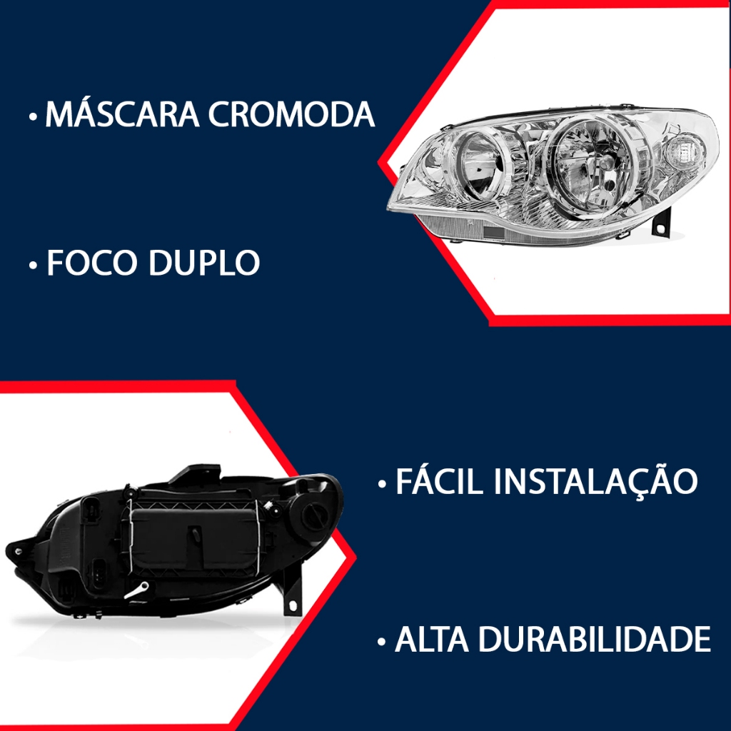 PAR FAROL PALIO SIENA STRADA G3 2005 2006 2007 2008 2009 2010 2011 2012 2013 2014 2015 2016 CROMADO ATENÇÃO: - Valor Referente ao Par (Lado Direito + Lado Esquerdo). COMPATÍVEL COM: - Palio G3 2005 a 2016; - Siena G3 2005 a 2016; - Strada G3 2005 a 2016; - Weekend G3 2005 a 2016. ESPECIFICAÇÕES TÉCNICAS: - Lente Lisa em Acrílico; - Carcaça em Plástico; - Foco Duplo; - Máscara Cromada; - Regulagem de Foco Manual; - Encaixe de Lâmpada: Alta - H7 (Não Acompanha Lâmpadas e Soquetes); - Encaixe de Lâmpada: Baixa - H7 (Não Acompanha Lâmpadas e Soquetes); - Suporta Xênon e Lâmpadas de até 55W; - Encaixe Perfeito Sob Medida; - Ótima Qualidade e Acabamento. ATENÇÃO: - Garantia de 3 Meses; - Valor Referente ao Par (Lado Direito + Lado Esquerdo). - Recomendamos que a instalação seja feita por um profissional e não nos responsabilizamos pelo mau uso do produto. *As compras realizadas em nome de Pessoa Jurídica estão sujeitas à cobrança de ICMS, conforme Protocolo ICMS 41, de 4 de Abril de 2008. Caso você tenha dúvidas sobre o percentual a ser aplicado, consulte a Cláusula Segunda, §1° do referido Protocolo.