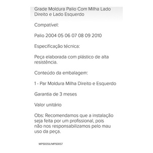 Descrição do Produto Par Moldura Farol Milha Palio Siena Strada G3 2003 04 À 2010 Mais informações Marca: 67781 Descrição completa Par Moldura Farol Milha Palio Siena Strada G3 2003 04 À 2010 Grade Moldura Palio Siena Strada Com Milha Lado direito e Lado esquerdoCompatível:Palio Siena Strada:Ano 2003 04 05 06 07 08 09 2010Especificação técnica:Peça elaborada com plástico de alta resistência.Conteúdo da embalagem:1 - Par Moldura Milha lado direito e lado esquero Garantia de 3 mesesValor unitárioObs: Recomendamos que a instalação seja feita por um profissional, pois não nos responsabilizamos pelo mau uso da peça. AGRADECEMOS A SUA VISITA! MPS056/057 AGUARDAMOS A SUA COMPRA !