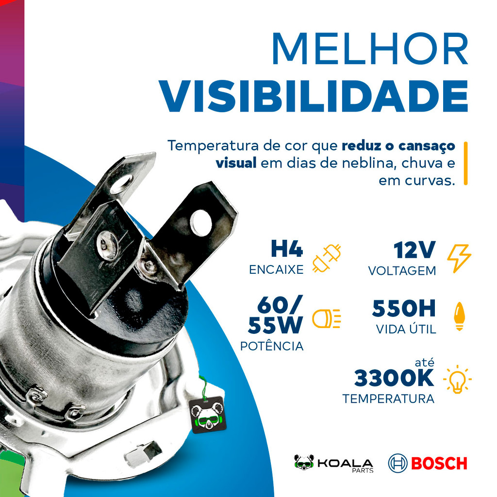 Par Lâmpada Automotiva Halógena H4 Pure Light 12V 60/55W P43t Bosch Dirigir no escuro ou na neblina com luz fraca? Esquece! A Bosch, líder mundial em autopeças, sabe que no volante visibilidade é vida. A H4 Pure Light entrega a luz que você precisa para dirigir com segurança e presença. - Encaixe H4 P43t - Luz branca amarelada que não cansa a visão - Maior visibilidade em chuva, neblina e curvas Sinta a clareza e a visibilidade que a linha Pure Light oferece — qualidade Bosch com a mesma precisão das peças originais do seu veículo. TECNOLOGIA COM BRILHO INTENSO E ESTÁVEL Oferece luz forte e acionamento rápido para você enxergar mais e melhor. RESISTÊNCIA AO SUPERAQUECIMENTO Material reforçado para maior durabilidade e vida útil prolongada, com até 550 horas de uso. ATÉ 3.300 K COM LUZ BRANCA AMARELADA Temperatura de cor que reduz o cansaço visual em neblina, chuva e curvas. E o melhor? Elas duram muito mais, pra você trocar menos e dirigir tranquilo. Fácil de instalar, perfeita pra quem quer qualidade e praticidade na mesma peça. Encaixe H4 e base P43t, ideal para: - Faróis de neblina - Luz de estrada / cruzamento - Faróis auxiliares Dicas de Manutenção Bosch: 1. Tenha sempre reserva: Leve uma lâmpada extra no carro para emergências. 2. Use luvas na troca: Evita marcas nos vidros e aumenta a vida útil. 3. Troque em pares: Se uma queimou, a outra logo vai falhar. 4. Renove a cada 2 anos: Luzes perdem intensidade com o tempo. Enviamos bem embalado, super rápido e com garantia de originalidade. A segurança na estrada começa pela clareza com que você enxerga o mundo lá fora. Garanta a sua e confira os outros produtos da nossa loja – Koala Parts Especificações Técnicas: Encaixe: H4 Base: P43t Tecnologia: Halógena Cor: Branca amarelada Temperatura: Até 3.300 K Fluxo luminoso: Até 1.450 lm Vida: Até 550 horas Tensão nominal: 12V Potência: 60/55W Linha: Pure Light Código Bosch: 0 986 AL1 513 Conteúdo da Embalagem: 1 Par Lâmpada Halógena H4 12V 60/55W P43t Bosch