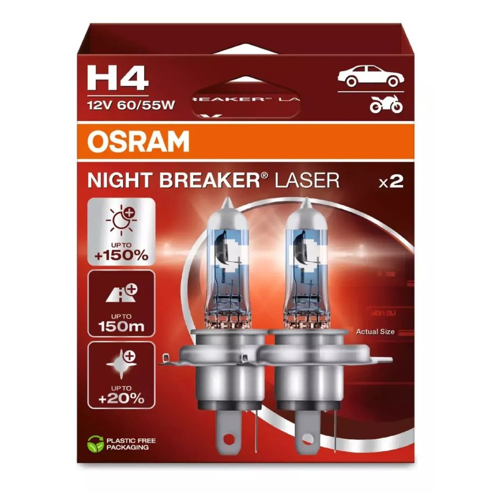 Lâmpada H4 Osram Night Breaker Laser Confira a nova geração Night Breaker Laser - a lâmpada halógena da Osram que entrega maior performance e segurança a você! Usando uma tecnologia inovadora a laser, as lâmpadas entregam um brilho até 150% maior em comparação com o padrão legal mínimo, através de um filamento altamente projetado, que garante uma saída de luz extra. Assim, as lâmpadas fornecem um feixe de até 150 metros de comprimento e uma luz até 20% mais branca também em comparação com o padrão legal mínimo. Com uma visibilidade mais leve e melhorada, o produto é essencial para ajudar os motoristas a identificar e reagir aos riscos de tráfego de uma maneira mais rápida. Diferenciais do Produto: - Maior performance: um feixe de até 150m de comprimento e 150% a mais de brilho - Para você que procura maior performance e alcance ao dirigir - Aplicação: Farol Alto, Farol Baixo ou Farol de Milha - Até 150% mais Luz que as Lâmpadas Halógenas Comuns - Alcance até 150m de comprimento - Luz Até 20% mais branca que uma lâmpada padrão - Facilita a Detecção de Obstáculos e Placas de Sinalização Dados Elétricos, Fotométricos e do Produto: - Lâmpada Certificada pelo INMETRO - Temperatura de Cor: 3900K - Lúmens: 1650/1000 lm - Tensão: 12V e Potência: 60/55W - Soquete (base): P43t Espectativa de Vida - Vida estimada B3 - 80 / 200 (Filamento 1 / Filamento 2) - Vida estimada Tc - 160 / 400 (Filamento 1 / Filamento 2) Importante: - Garantia de 3 Meses. - Valor do Par. - Imagens Meramente Ilustrativas. - Recomendamos que a instalação seja feita por profissional especializado e não nos responsabilizamos pelo mau uso do produto. - Produto sujeito a alterações de fábrica sem aviso prévio.