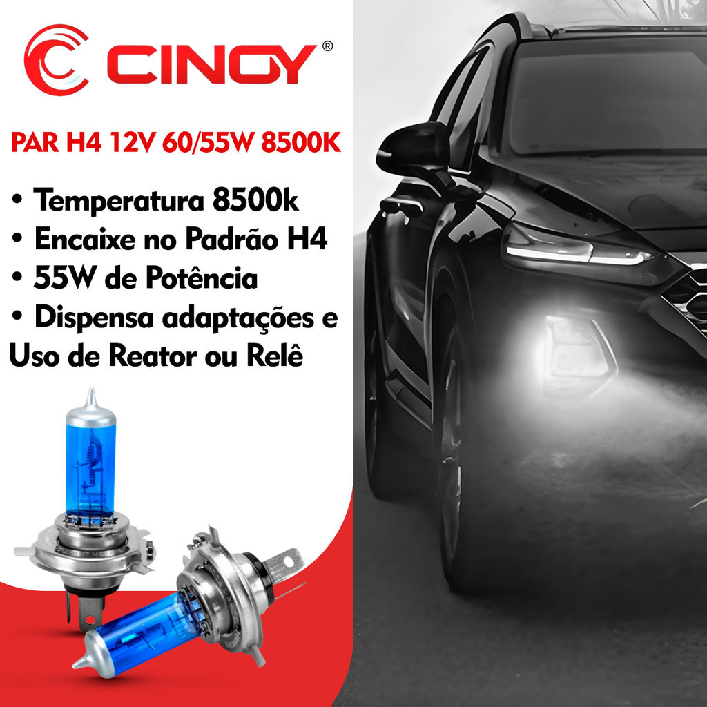🚗💡 ILUMINAÇÃO SUPER BRANCA 8500K TIPO XENON, MAIS VISIBILIDADE E VISUAL MODERNO! O Par de Lâmpadas Automotivas Cinoy H4 Super Branca 8500K Tipo Xenon é ideal para quem deseja melhorar a iluminação do farol baixo e alto, garantindo mais segurança e um visual moderno para o veículo. A tonalidade 8500K entrega uma luz super branca com efeito xenon, proporcionando melhor clareza da pista e valorizando o design do carro. Com potência de 55W, tensão 12V e base P43t, a instalação é simples (plug and play), sem necessidade de adaptações. ✅ Principais Benefícios ✔ Lâmpada H4 Super Branca 8500K ✔ Tipo Xenon – visual moderno e elegante ✔ Potência 55W / 12V ✔ Produto Original Cinoy – qualidade e durabilidade ✔ Base P43t / Encaixe padrão H4 ✔ Função Farol Baixo e Alto ✔ Instalação fácil e rápida 🔧 Especificações Técnicas Tipo: Lâmpada Automotiva H4 Temperatura de cor: 8500K Potência: 55W Tensão: 12V Base: P43t Cor da luz: Super Branca (Tipo Xenon) Marca: Cinoy 📦 Conteúdo da Embalagem ✔ 2 Lâmpadas H4 (Par) 🚘 Veículos Compatíveis (Exemplos) ✔ Volkswagen: Gol ✔ Chevrolet: Celta, Onix ✔ Fiat: Palio ✔ Hyundai: HB20 (e outros veículos que utilizam lâmpada H4) ⚠️ Sempre confirme o modelo correto no manual do veículo. ⚡ Produto à pronta entrega | Envio rápido | Excelente custo-benefício 👉 Compre agora suas Lâmpadas H4 Cinoy e renove a iluminação do seu carro!