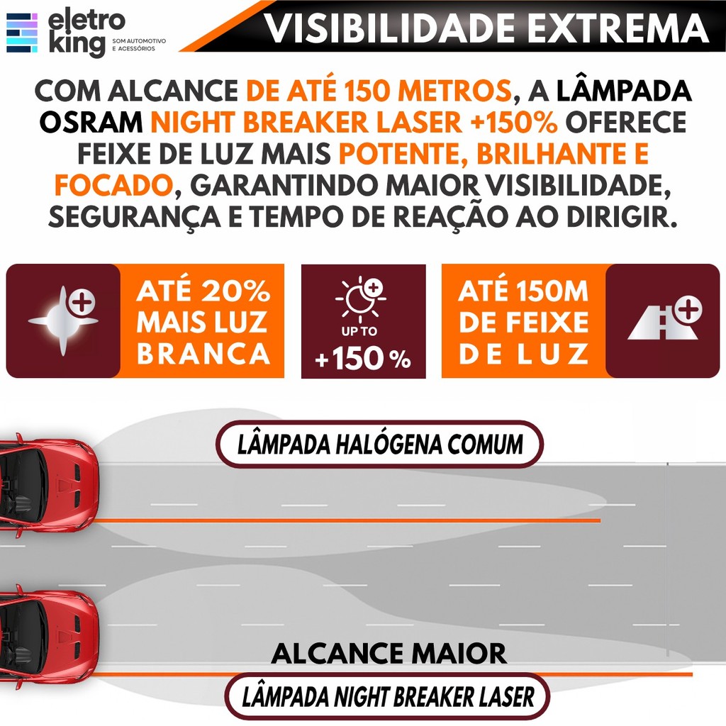 Par Lâmpada Halógena Osram Night Breaker Laser +150% Luz H11 55W 12V Confira a nova geração Night Breaker Laser - a lâmpada halógena da Osram que entrega maior performance e segurança a você! Usando uma tecnologia inovadora a laser, as lâmpadas entregam um brilho até 150% maior em comparação com o padrão legal mínimo, através de um filamento altamente projetado, que garante uma saída de luz extra. Assim, as lâmpadas fornecem um feixe de até 150 metros de comprimento e uma luz até 20% mais branca também em comparação com o padrão legal mínimo. Com uma visibilidade mais leve e melhorada, o produto é essencial para ajudar os motoristas a identificar e reagir aos riscos de tráfego de uma maneira mais rápida. Especificações Técnicas: • Marca: Osram • Modelo: H11 • Potência: 55W • Linha: Night Breaker Laser +150% Luz • Tecnologia: Halógena • Tensão: 12V • Tipo de soquete: PGJ19-2 • Lúmens: 1350 lm • Temperatura de Cor: 3900K • Durabilidade confiável que acompanha seu desempenho superior. • Instalação fácil, sem adaptações. • Homologada pelo Inmetro • Facilita a Detecção de Obstáculos e Placas de Sinalização • Aplicação: Farol alto, farol baixo ou farol de milha (dependendo do veículo). • Alcance do feixe de luz: Até 150 metros. • Benefício: Até +150% mais luz comparado a lâmpadas comuns. Conteúdo da Embalagem: • 02 Lâmpada Halógena Osram Night Breaker Laser +150% Luz H11 Importante: • Garantia de 90 Dias. • Valor do Par.