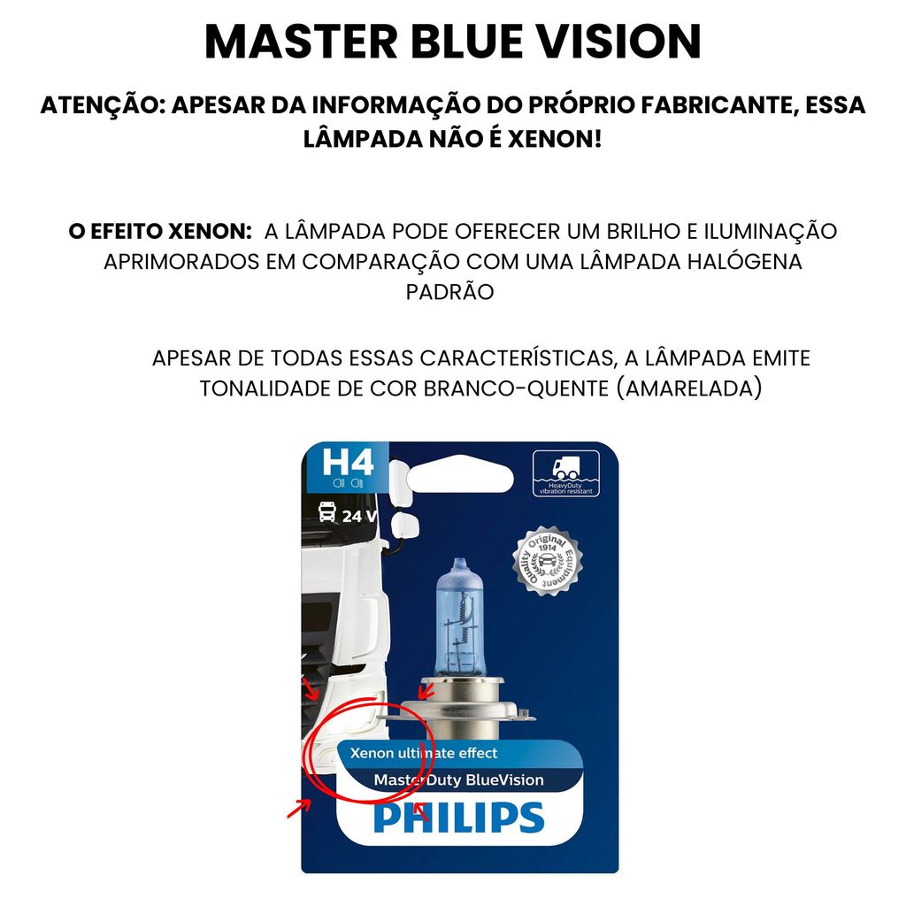 PAR LÂMPADA HALÓGENA PHILIPS MASTER DUTY BLUE VISION FAROL ALTO BAIXO H4 70W/75W CAMINHÃO 24V