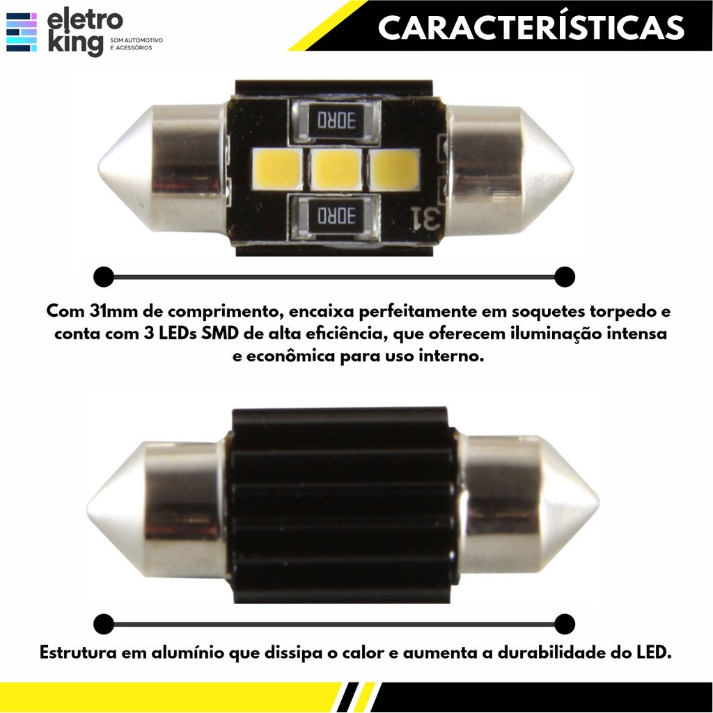 Par Lâmpada Led Torpedo 31mm 3 SMD Shocklight - SLL-1231 A Lâmpada LED Torpedo Shocklight conta com 3 LEDs SMD de alta eficiência, proporcionando iluminação intensa com baixo consumo de energia. Possui estrutura em alumínio que atua como dissipador térmico, aumentando a durabilidade do LED, além de lente em policarbonato resistente ao calor. Com 31mm de comprimento, é ideal para aplicação em luzes internas como teto, porta-luvas e porta-malas, oferecendo fácil instalação e excelente desempenho. Especificações Técnicas: • Marca: Shocklight • Encaixe: Torpedo 31MM • Cód. de Referência: SLL-1231 • Temperatura de Cor: 6000k (Branco frio) • Fluxo luminoso: 400 lúmens • Voltagem: 12V • Dissipador: Alumínio • Resistência à Vibração • IP RATE: IP65 • Longa Vida Útil • Certificado pelo INMETRO • Observação: LEDS: 3PCS (2835 SMD) Conteúdo da Embalagem: • 01 Par Lâmpada Led Torpedo 31mm 3 SMD Shocklight Importante: • Garantia de 90 Dias. • Valor do Par.