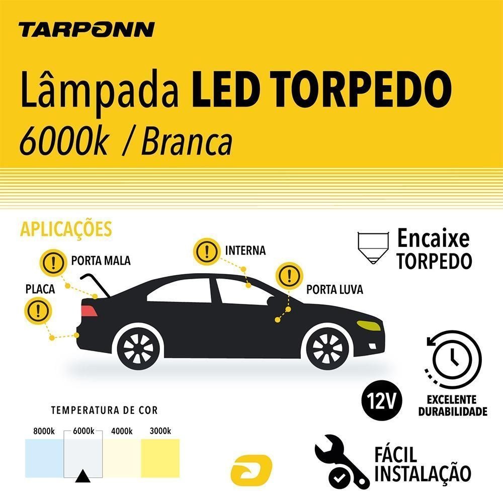 Lâmpada Tarponn LED Torpedo SJ-COB-12C-41MM 12v 6000k Características: Baixo consumo Durabilidade superior Iluminação branca fria Fácil instalação Aplicação: iluminação de ambientes internos, como luz de teto, porta-malas, porta-luvas e placa O melhor custo-benefício em iluminação automotiva é aqui, com a Lâmpada Tarponn LED Torpedo SJ-COB-12C-41MM 12v 6000k! Conheça agora o LED COB Tarponn, considerado a nova tendência em luz automotiva. Sabia que a tecnologia COB oferece uma área de luz superior (até 10x maior) e ainda evita o desconforto visual, por proporcionar distribuição homogênea de luminosidade através dos chips unificados sob um revestimento especial de fósforo amarelo? Além disso, sua construção dispersa calor rapidamente e permite vida útil prolongada além de maior eficiência energética. Perfeita para a iluminação de ambientes internos, como luz de teto, porta malas, porta luvas e placa. Para quem busca tecnologia e durabilidade, a Lâmpada Tarponn LED Torpedo SJ-COB-12C- 41MM 12v 6000k é uma excelente alternativa! Ficha técnica: Cor: Branca fria Temperatura de Cor: 6000k Encaixe: Torpedo Tensão: 12v Equivalência: 10w Tipo de LED: COB Linha: Standard Fluxo luminoso: 240 Im
