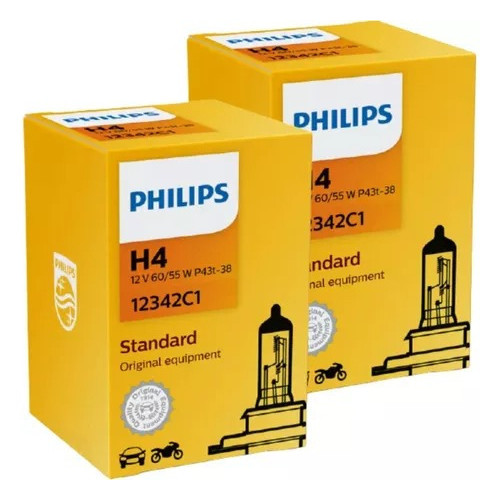 Lâmpada H4 12v 60/55w. Conteúdo: 2 (duas) lâmpadas. Marca: Philips, Código do Fabricante: 12342C1. Produto novo, original e com garantia. Qualidade de equipamento original Tipo de lâmpada: H4 12 V, 60/55 W P43t-38 Aplicação: Motos e Veiculos que utilizam lâmpada H4 12v 60/55w (Farol Alto e Baixo na mesma lâmpada) A nossa empresa comercializa apenas produtor originais de fabricantes certificado pelo ISO 9001. ATENÇÃO - Não nos responsabilizamos pelo mau uso ou instalação indevida do produto, sempre recomendamos que a instalação seja feita por um profissional especializado. - Imagens meramente ilustrativas.