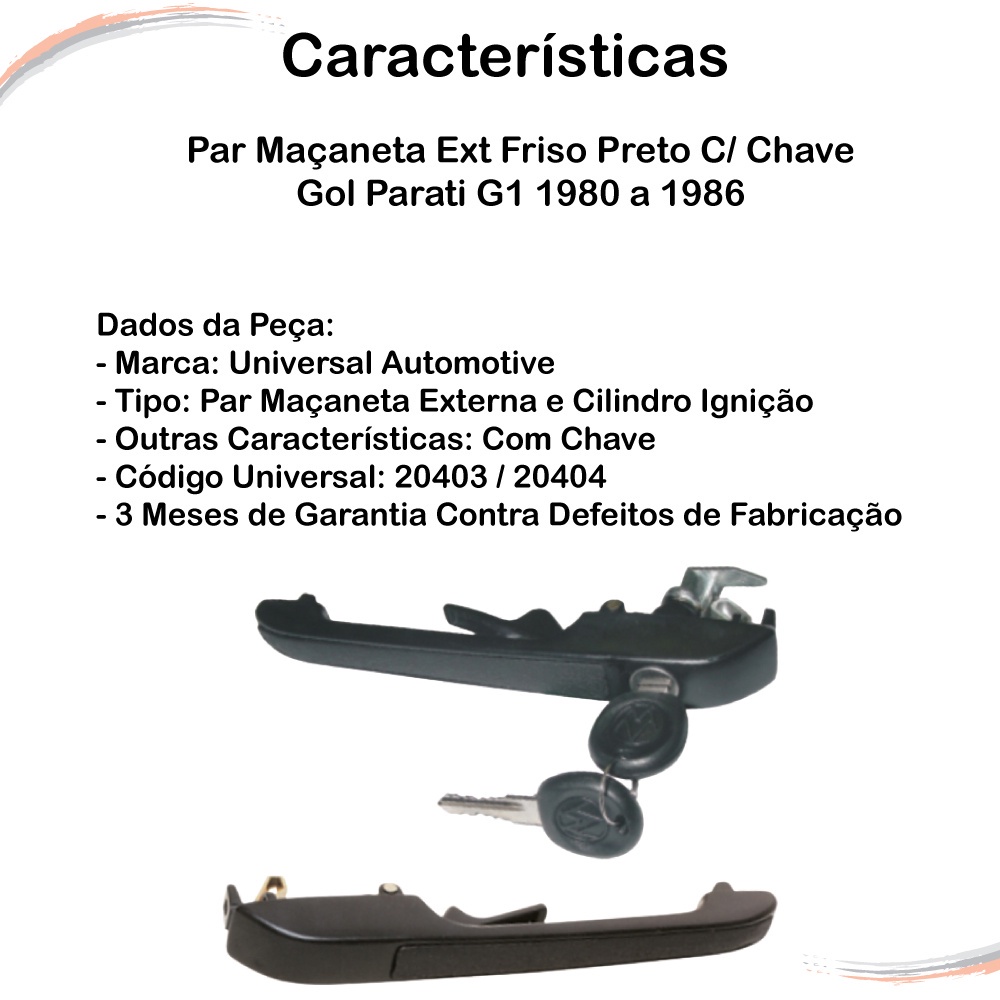 CONTEÚDO DA EMBALAGEM:Par Maçaneta Externas - Com Friso Preto - Encaixe S - Gol e Parati G1 1980 a 1986 APLICAÇÃO NOS SEGUINTES VEÍCULOS: Volkswagen: - Gol G1 1980 a 1986 - Parati G1 1982 a 1986 - Saveiro G1 1982 a 1986 - Voyage G1 1982 a 1986 ESPECIFICAÇÕESMarca: Universal Automotive SystemsCódigo Universal do Produto (EAN): 7906400610234SKU Universal: 20403 / 20404 Garantia do Fabricante: 3 Meses contra defeitos de fabricação Instalação: Este é um produto técnico e deve ser aplicado por um profissional, assim se garantia a longa vida útil do mesmo. História A Shoppeças é uma empresa especializada em E-COMMERCE, e disponibilizamos um portfólio de mais de 30 mil itens no setor Automotivo, nos segmentos de ferragens automotivas (fechaduras, maçanetas, cilindros, trincos de quebra vento), máquinas do vidro elétricas e manuais, tampas automotivas, borrachas de vedação, linha de suspensão e direção, amortecedores mola a gás, acessórios automotivos e palhetas. Todos com portfólio completo para linha leve, pesada, pick-ups e vans. Envios Realizamos todos os nossos envios em até 24 horas após o faturamento.